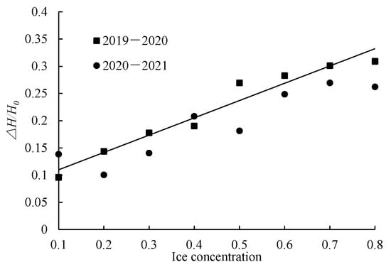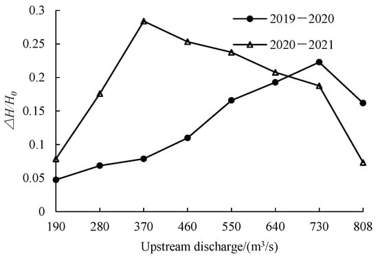 To further analyze how the highly sensitive factors—ice concentration N and discharge Q—affect water-level variations at the Toudaoguai reach during the stable ice-covered period. Figure 13 and Figure 14 give the relationship between the flow ice concentration N and discharge Q in the upstream channel of the Shisifenzi bend and the relative increment of water level in freeze-up period ΔH/H0, where ΔH is the increase in cross-sectional water level during the ice period, and H0 is the water depth without ice. It can be seen from Figure 13 that the ice concentration N and the relative increment of water level in the freeze-up period show a linear growth relationship of ΔH/H0, while the relative increment of water level in the freeze-up period increases first and then decreases with the increase in upstream flow, and the discharge corresponding to the maximum increment of water level in different years is inconsistent. The discharge at the maximum increment of water level in the freeze-up period from 2019 to 2020 is 730 m3/s, and the discharge at the maximum increment of water level in winter from 2020 to 2021 is 370 m3/s. The increase in water level is mainly affected by the increase in discharge and the accumulation of ice [33]. The increase in discharge has a relatively stable influence on the rise in water level, while the accumulation of ice has a great influence on the rise in water level, which is the reason why the relative increment of water level has a peak value (as shown Figure 14). The growth mode of ice cover in the studied river section is hydraulic thickening and mechanical thickening. When the discharge is small, the ice cover is hydraulic thickening, and the backwater effect of the water level channel is not obvious. When the flow rate increases, the mechanical thickening mode of the ice cover begins to occur. After a large amount of flowing ice accumulates into ice jams under mechanical action, the water level of the river channel is obviously raised, and the relative increment peak of the water level appears. However, with the further increase in flow rate, the hydraulic effect is further strengthened, resulting in the accumulation of ice at the bottom of the ice cover gradually being eroded away, the backwater phenomenon gradually weakened, and the relative increment of water level decreased. Therefore, the relationship between the upstream discharge Q and the relative increment of water level in the freeze-up period ΔH/H0 increases first and then decreases. The discharge corresponding to the relative increment peak of water level in different years is different, which needs to be further discussed according to the factors such as ice form and the ice jam location in the year.