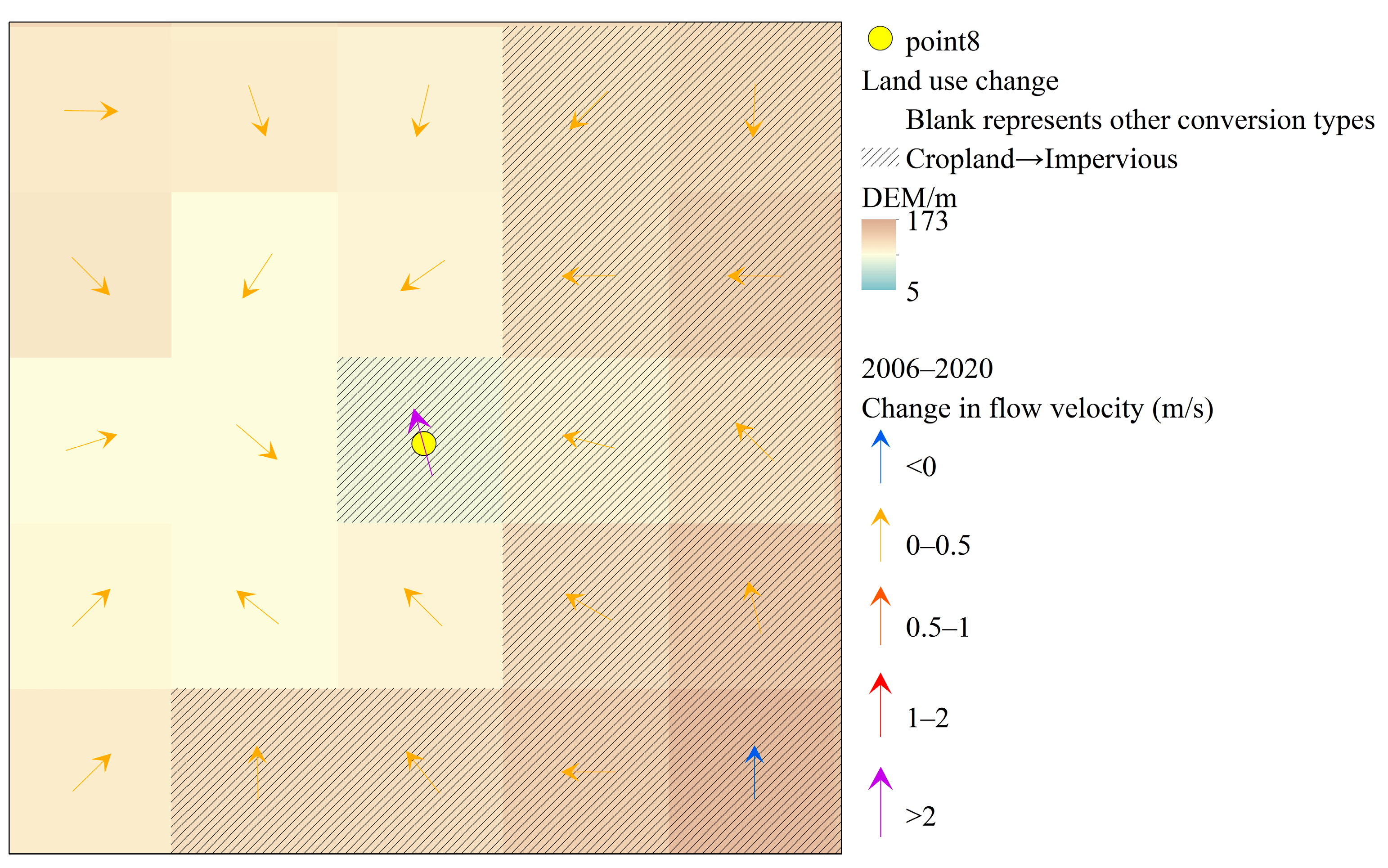Under the conditions of using 30 m DEM and NewFlood two-dimensional hydrodynamic model Settings, this study compared the water flow directions of two flood-prone points in the scenarios of 2006 and 2020. The results showed that the differences in water flow patterns simulated in the two periods were not significant, indicating that under the current resolution and modeling framework, The undulation of the terrain has an important influence on the direction of local water flow. Flood-prone points 7 and 8 are located in the surrounding low-lying areas. Although the digital elevation model data shows that their altitudes are relatively low, there are differences in topographic features: low-lying terrain is prone to accumulate rainwater and accelerate water flow, thereby increasing the risk of flooding.