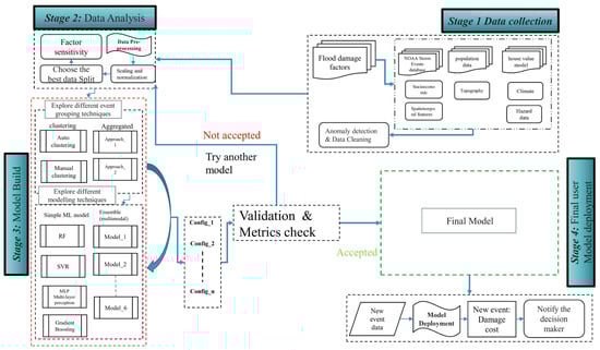 The proposed methodology (Figure 2) followed four integrated stages designed to ensure that flood damage costs were estimated consistently and transparently across the entire study area: Stage 1—Data integration and harmonization; Stage 2—Data analysis and feature preparation; Stage 3—Predictive model development and evaluation; and Stage 4—Framework deployment and validation.