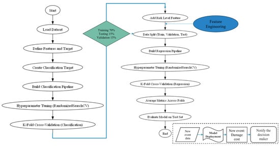 The final framework combined the classification and regression stages into a single, automated workflow (Figure 3). This structure handled normalization, oversampling, and feature selection, followed by parameter optimization to ensure repeatable and unbiased outcomes. The validated framework was then prepared for potential decision-support implementation, offering scalable capability for both real-time estimation and scenario-based flood-damage assessment. Continuous updates with new flood records will allow adaptive recalibration under evolving climatic and land-use conditions.