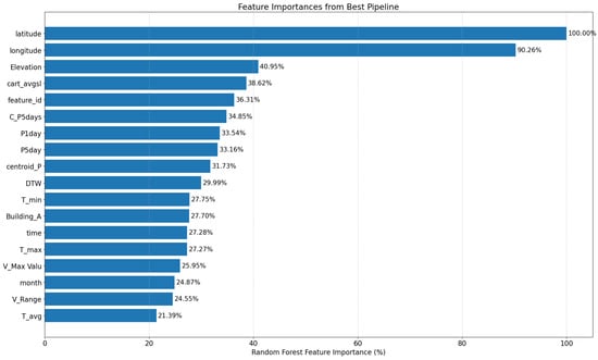 An additional analysis examined the feature-importance rankings produced by the Random Forest model. As shown in Figure 7, variables such as latitude, longitude, elevation, and average catchment slope emerged as highly influential predictors. These reflect the combined influence of geographic setting, topographic controls, and short-term hydrologic intensity in shaping damage outcomes.