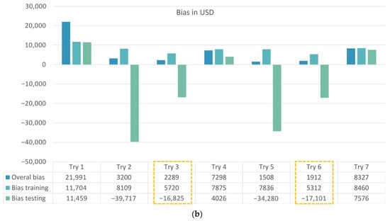 (a) Correlation coefficient for the 7 trials covering training, testing, and overall performance. (b) Bias in USD for the 7 trials covering training, testing, and overall datasets. (The yellow boxes show the best trials).