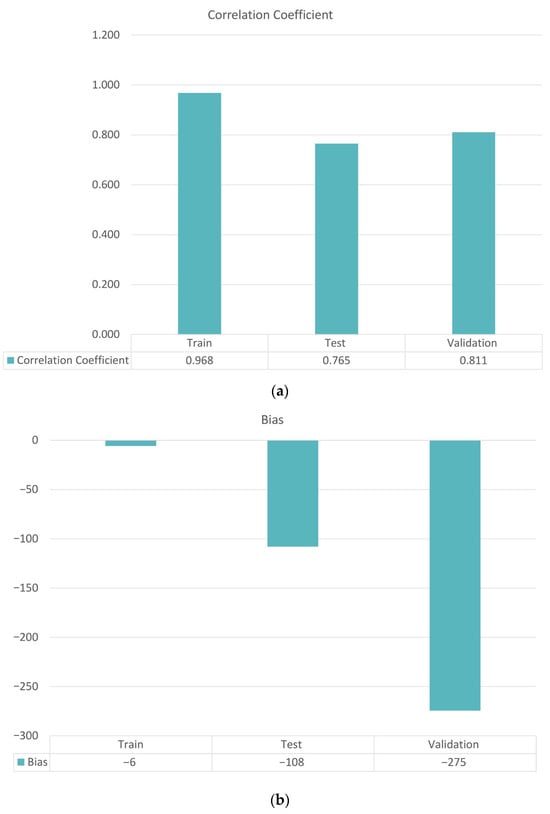 All configurations were assessed using the correlation coefficient (R) and bias (USD) for training, testing, and validation datasets, enabling a fair comparison of their predictive skill and systematic error.