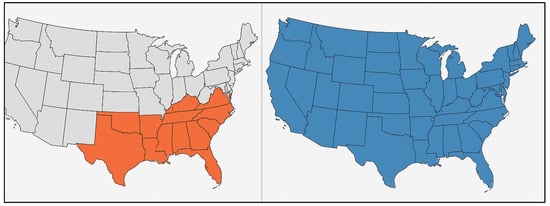 Population exposure was characterized using county-level data from the Surveillance, Epidemiology, and End Results (SEER) Program of the U.S. National Cancer Institute (NCI) (U.S. County Population Data 1969–2023—SEER Population Data), which provides annually updated population estimates consistent with U.S. Census standards [25].