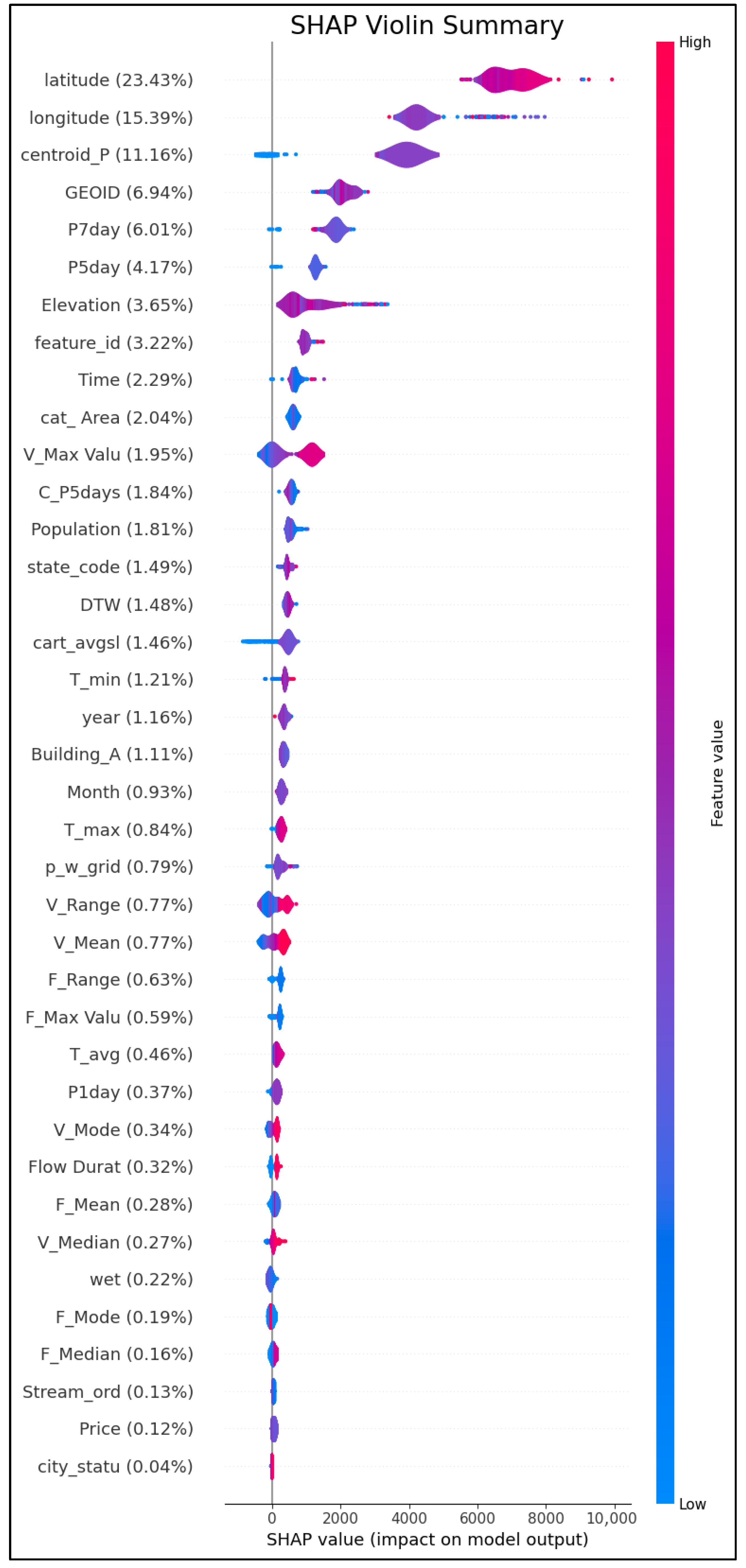 - Integration of multi-source datasets hydrologic (NWM), climatic (NOAA), topographic (NED), and socioeconomic (ZHVI, SEER) enabled event-specific, physically consistent predictions.