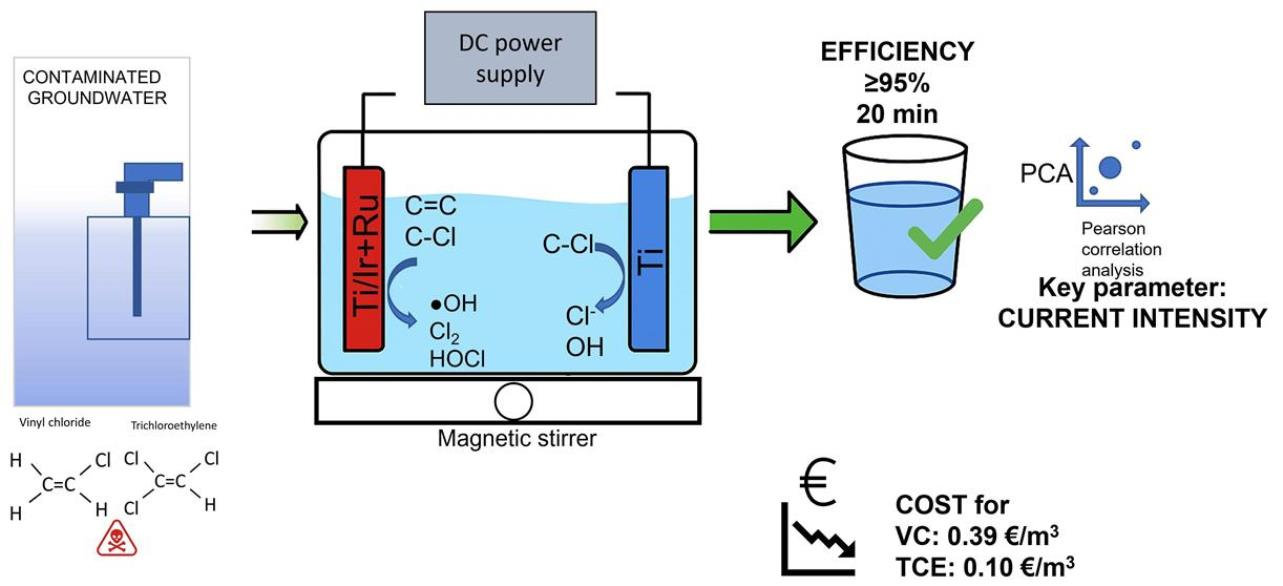 2 anodes enable efficient generation of electroactive chlorine species that play a key role in the indirect oxidation of Cl-VOC compounds, while titanium cathodes provide stable reductive conditions favourable for the dehalogenation of VC and TCE [