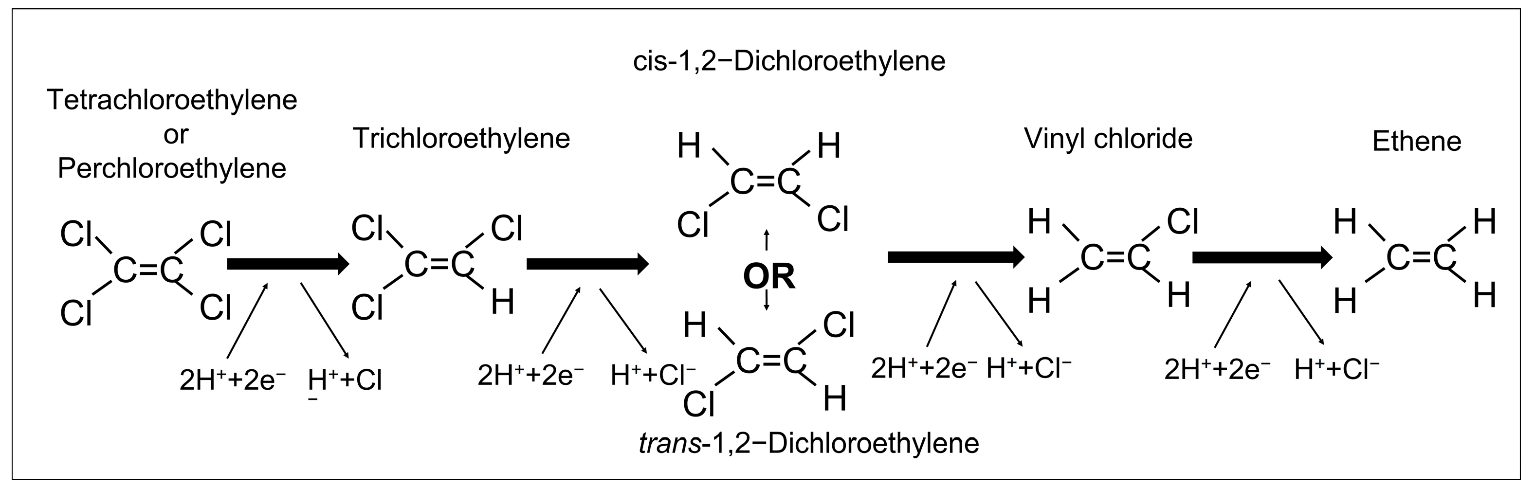 54]. These processes provide additional evidence for the distinct dominant degradation pathways of VC and TCE, namely intense cathodic reduction for VC (C