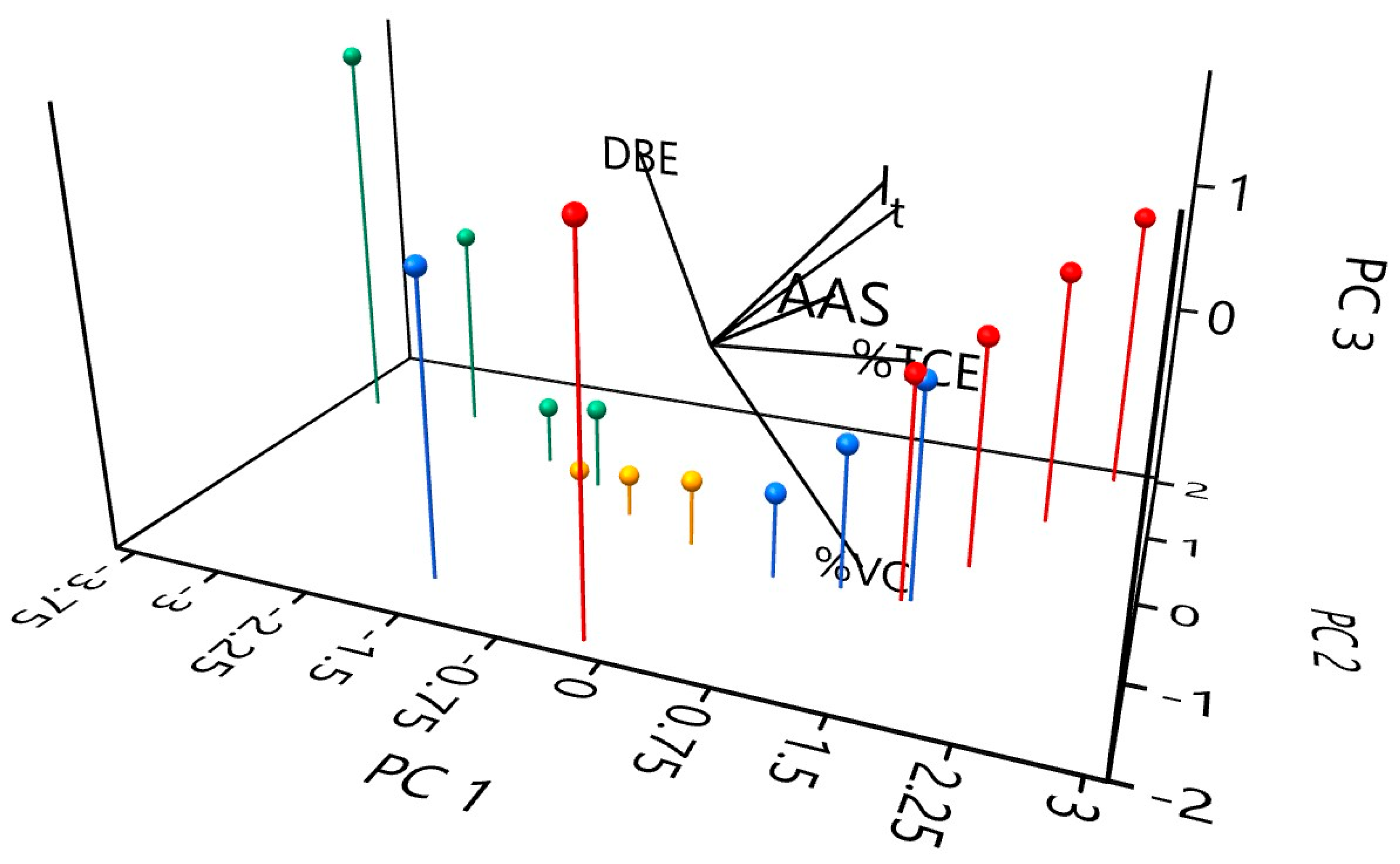 Principal Component Analysis (PCA) was applied to assess the influence of key parameters on the efficiency of VC and TCE removal by electrochemical treatment. PCA reduced the dimensionality of the dataset, which comprised six variables, including four operational parameters (t, I, AAS, DBE) and two output variables related to process efficiency (%VC and %TCE), to three principal axes (