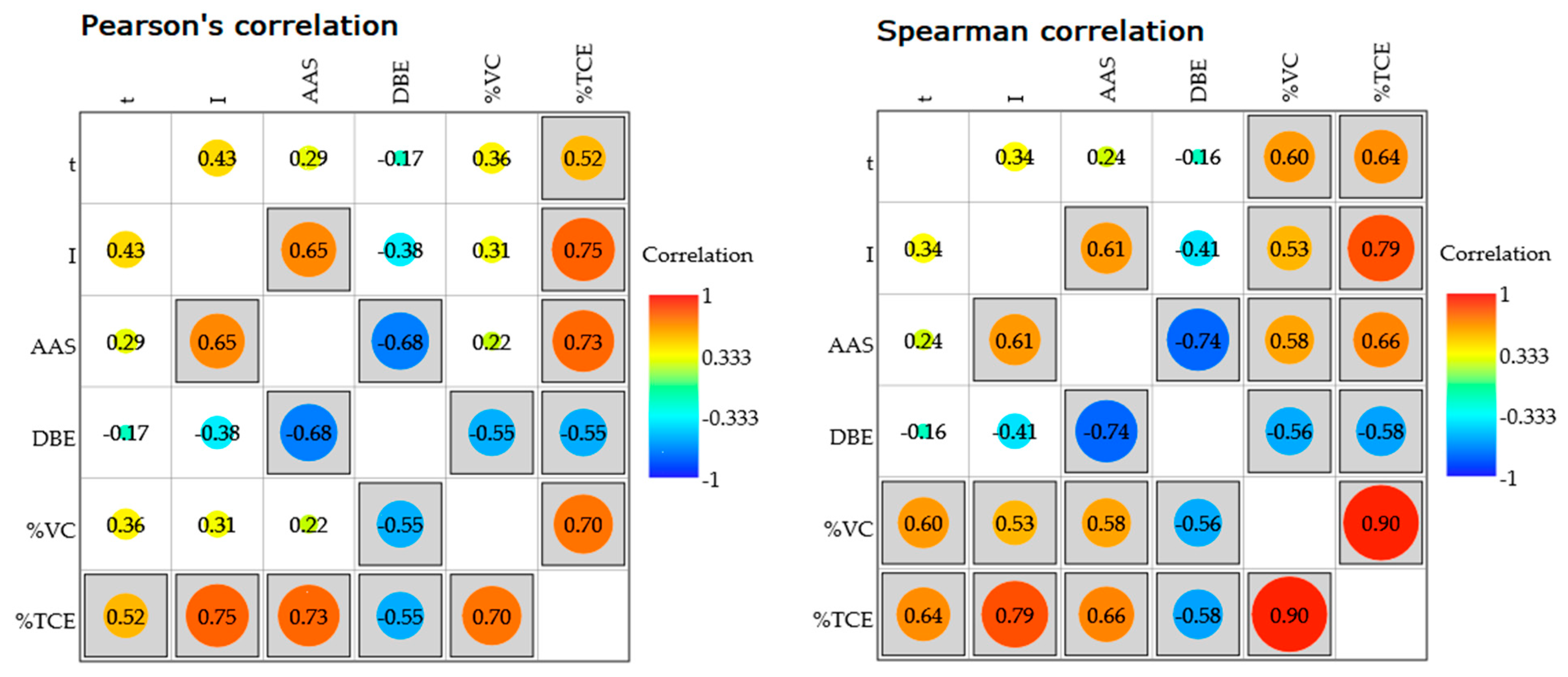 Figure 8), positive correlations are represented by orange dots, while negative correlations are shown as blue dots. The colour intensity and symbol size are proportional to the absolute values of the correlation coefficients, such that darker and larger dots indicate stronger statistical relationships between the analysed variables. Correlations highlighted with light grey boxes are statistically significant (