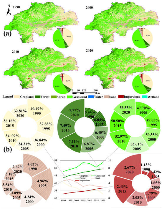 Socioeconomic development drives dynamic changes in fundamental natural resources such as water and land. Land use/land cover (LULC) serves as a primary indicator and nexus of these transformations [1,2]. Globally, LULC has shifted from forests to croplands and urban areas over the past 300 years [1,3]. The contraction of forest area contributes to climate change and ecological imbalance [4], and its expansion typically reduces water yield and soil erosion while an increase in urban elevates the risk of urban flooding [5]. In China, forest area decreased by 22% (from 176.1 to 137.7 million ha), whereas cropland increased by 42% (from 94.9 to 134.7 million ha) and urban land expanded 1075% (from 1.6 to 18.8 million ha) between 1700 and 2005 [6]. China has undertaken substantial vegetation-restoration efforts in recent decades, including the Three-North Shelterbelt Development Program and the Grain for Green Project [7]. The resulting increase in vegetation cover has delivered considerable ecological benefits; for example, carbon sequestration in the Three-North Shelterbelt increased by an average of 1.92% per year from 1990 to 2015 [8]. In arid basins, the expansion of forests and grasslands is a key indicator of terrestrial ecological restoration [9,10], and can mitigate soil desertification and enhance regional precipitation. By contrast, urban expansion increases environmental burdens and water pollution [11]. Therefore, LULC changes have significant impacts on economic development, water security, and the hydrological cycle at the basin scale [12,13,14], and rational land development can enable the coordination of high-quality development and high-level protection [15]. Analyzing long-term LULC dynamics at regional or basin scales provides critical insights to guide future ecological integrity, socioeconomic development, resource endowments, and industrial planning [2,16].