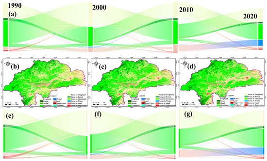 Transition matrix of LULC from 1990 to 2000 (b), from 2000 to 2010 (c), from 2010 to 2020 (d) in the WLRB ((a,e–g) represent Sankey diagrams of land use change; (a) illustrates the entire 30-year period, while (e–g) depict the three separate decadal intervals, respectively).