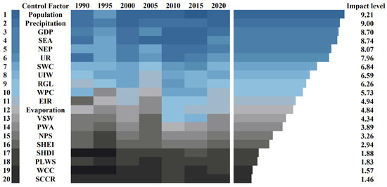 To systematically investigate the driving factors of LULC changes in the WLRB, an obstacle diagnosis model was applied to quantify the influence of 20 various factors from 1990 to 2020. The results, illustrating the influence degree of each factor, are presented in Figure 4.