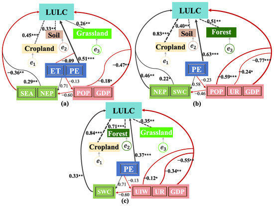 SEM results of WLRB in different groups. ((a)–(c) represent the path coefficients between three latent variables and different LULC. The gray arrow represents positive effects and the red one indicates negative effects. The numbers on the line indicate influence coefficients: * p < 0.05, ** p < 0.01, *** p < 0.001. Each groups’ CFI were greater than 0.88, and RMSEA were less than 0.087. The model was considered to pass).