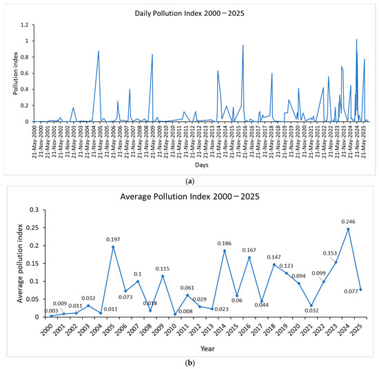 Figure 4a) show episodic spikes exceeding 1.0, particularly in 2005, 2016, and 2024, indicating acute contamination events. Mean annual pollution levels (