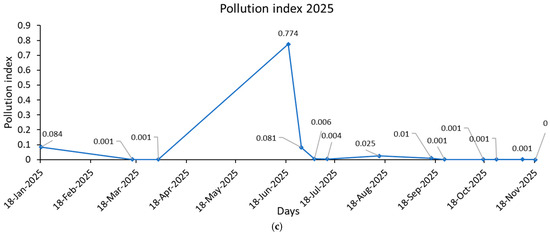 Figure 3c) reveals a pronounced spike on 19 June, where the composite index approaches 0.9, indicating a severe pollution event. This peak stands in stark contrast to the surrounding dates, which maintain values near 0.0, suggesting relatively low contamination levels. The timing of this surge, early summer, coincides with reduced lake volume and heightened agricultural activity, which may have contributed to increased runoff and sewage inflow. The diminished dilution capacity during this period likely amplified the impact of pollutants, underscoring the lake’s vulnerability to episodic contamination. This pattern highlights the need for targeted interventions during seasonal transitions and supports the use of satellite-derived pollution indices for early warning and management.