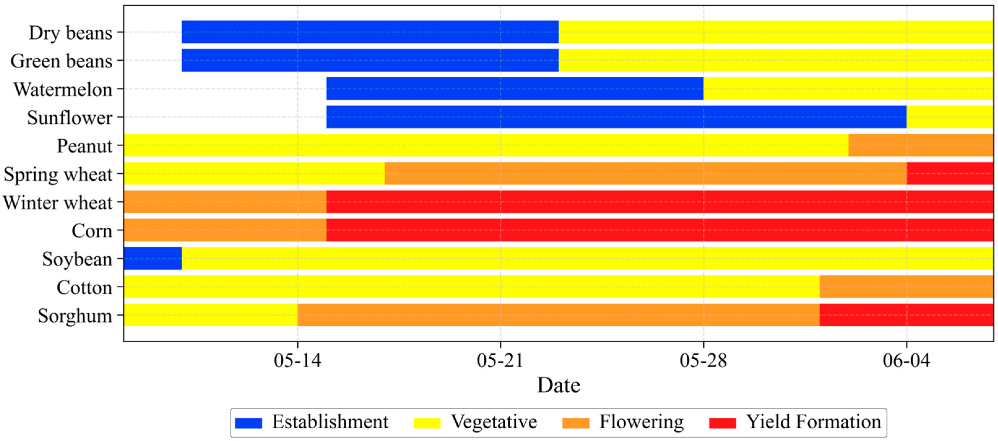 Crop variables reflect the agricultural dimension of water risk in the AWRI framework. This is relative to sensitivity to water stress (scarce and excess) and the adaptive capacity to mitigate such stress. The crop variable integration involved three major components: crop selection, growth stage identification, and tolerance classification. The crop selection process we used in this research was guided by both state and national agricultural data sources. According to [60,61], cotton, soybeans, corn, peanuts, wheat, green beans, dry beans, watermelon, sunflower, and sorghum are the most commonly cultivated crops across Alabama. To localize this selection to the ABBR, cropland cover data from the National Agricultural Statistics Service [62] were spatially analyzed using ArcMap 10.8. to confirm the presence and distribution of these crops in the ABBR. Additionally, we performed crop growth stages mapping using a classification system that included emergence, vegetative growth, flowering, yield formation, and ripening. Each development phase was assigned a standardized stage identifier (ID 0 to ID 4) for consistent integration into the AWRI scoring system. Planting start dates for each crop were aligned with recommendations by [63], allowing the establishment of a crop-specific calendar relevant to the regional climate and management practices. Figure 3 presents the weekly phenological progression of all crops included in this research over the four-week forecast horizon beginning 8 May 2024. For any week in which a crop is not in its active physiological growth, it was labeled “out of season” and excluded from AWRI scoring. Crops were then categorized based on their tolerance to hydrological stress at each growth stage. This classification system follows the assessments described in [64], using three tolerance levels that include high (H), moderate (M), and low (L). These tolerance ratings enabled a more granular sensitivity scoring process. This approach allows crop risk to reflect not just exposure but also biological vulnerability within the AWRI system over time.