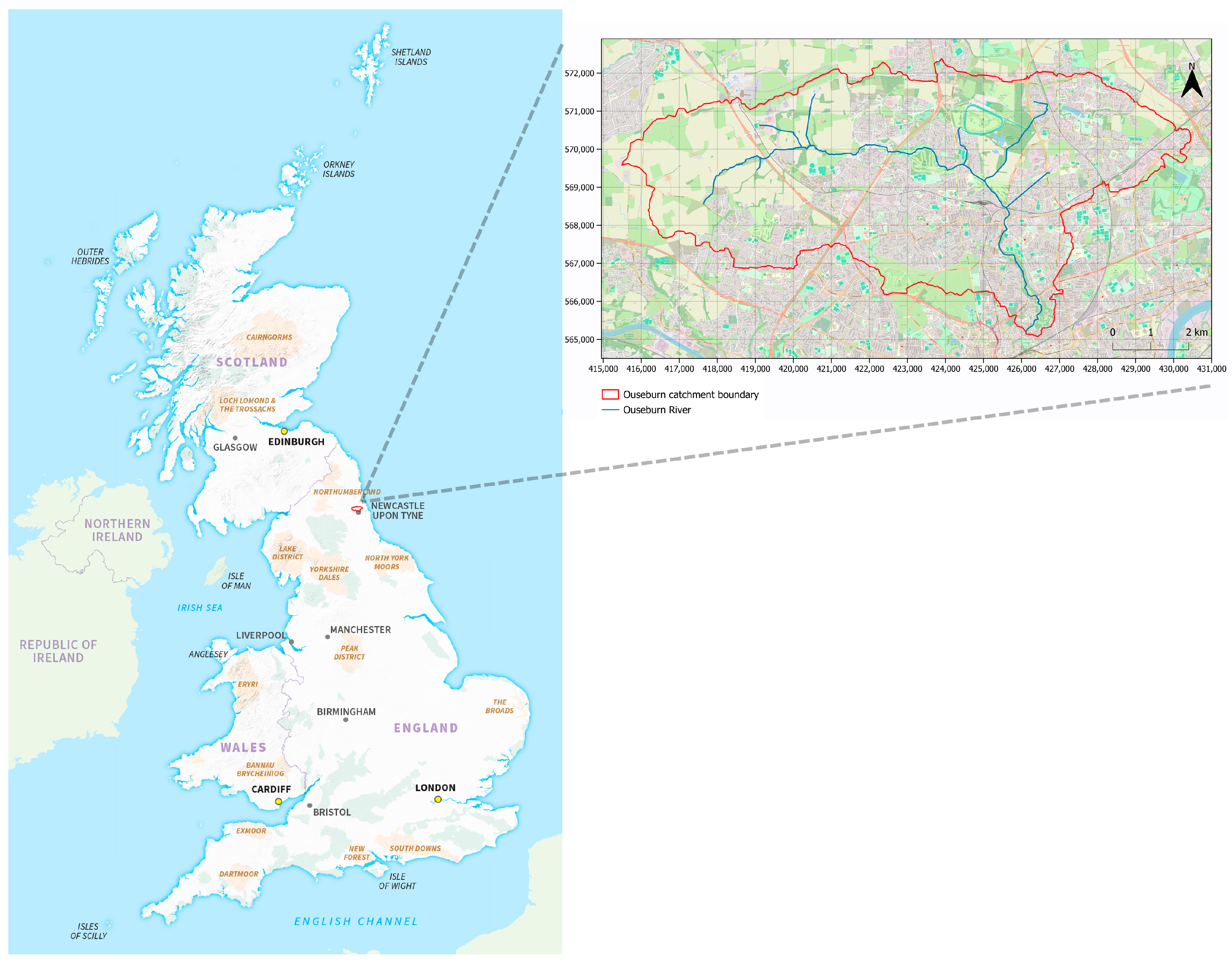 - Environment Agency. Ouse Burn from Source to Tyne Water Body—Catchment Data Explorer; Environment Agency: Bristol, UK, 2023.