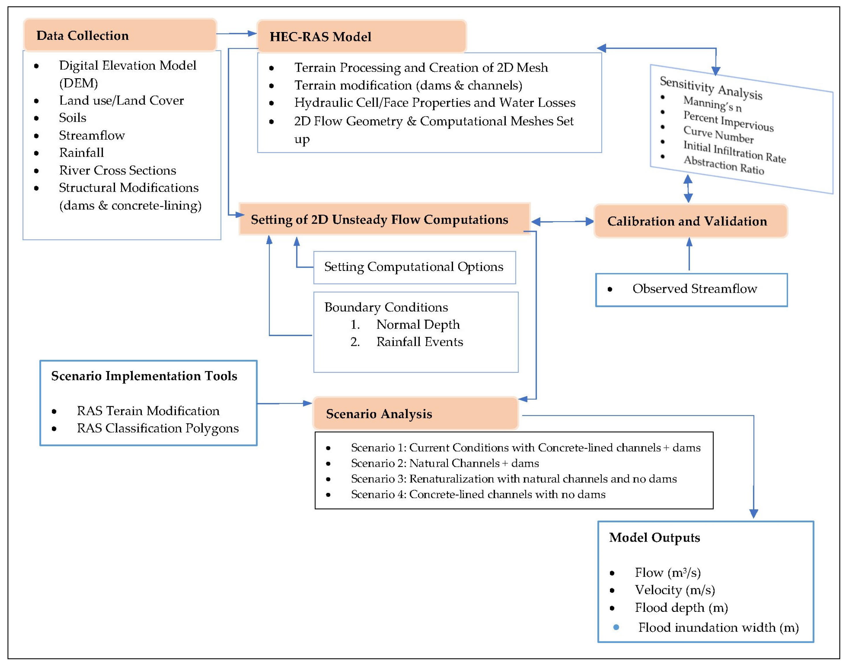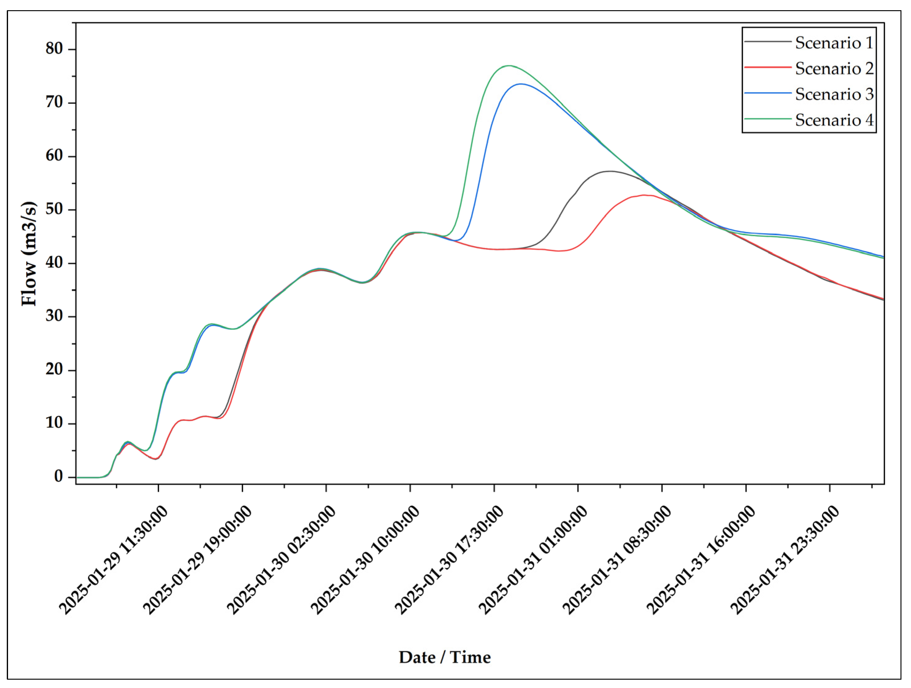 76]. Consequently, when dams are removed under Scenarios 3 and 4, this attenuation effect is lost and a larger proportion of event runoff is transmitted directly downstream, leading to higher and earlier peak discharges, reduced lag time, and increased flood depths and inundation width. As defined in the model setup, if a comparable rainfall event were to occur when the reservoirs are already at or near full supply level, the available storage for flood attenuation would be substantially reduced and a greater proportion of inflowing floodwaters would be routed downstream, resulting in increased peak discharge, reduced lag time, and enhanced downstream flood depths and inundation width [