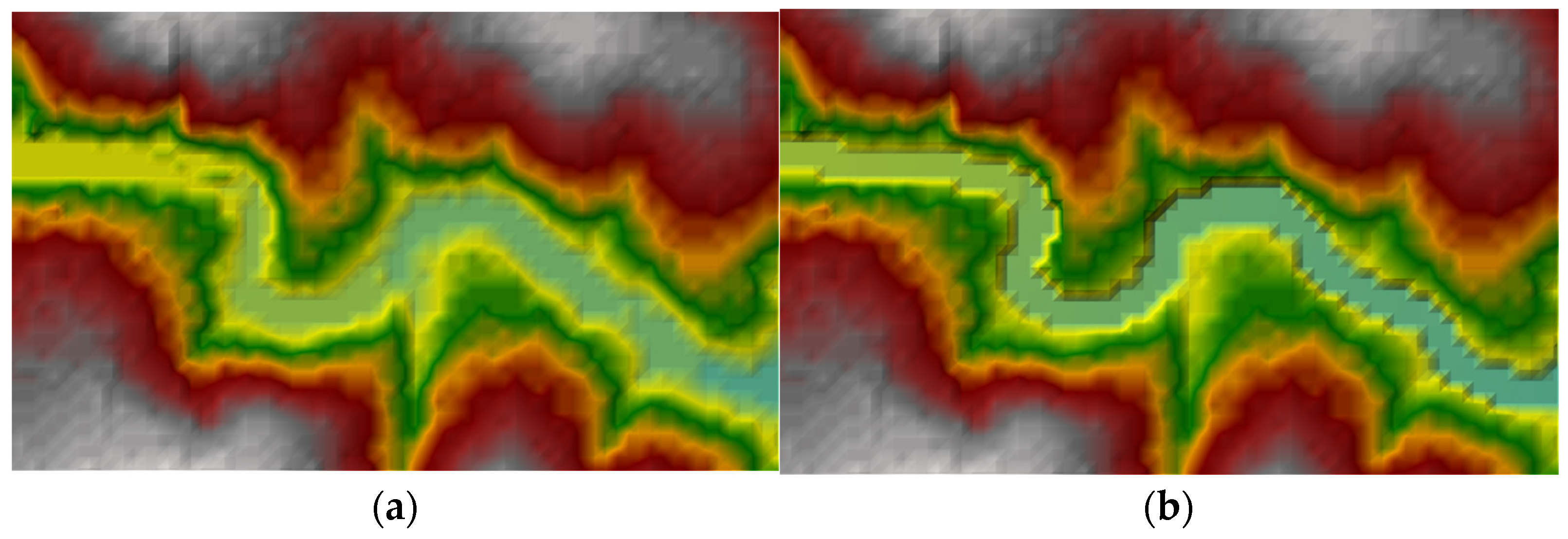 Figure 15a,b, likely due to the exclusion of secondary drainage features not captured in the river network datasets used in terrain modification. These visual discontinuities did not affect the hydraulic continuity of the main channels and had no notable impact on the overall simulation results. The results showed that in the concrete-lined channels, instantaneous maximum velocities increased and ranged between approximately 8 m/s and 20 m/s across the channel width. In the natural channel scenario, instantaneous maximum velocities were lower than 5 m/s.