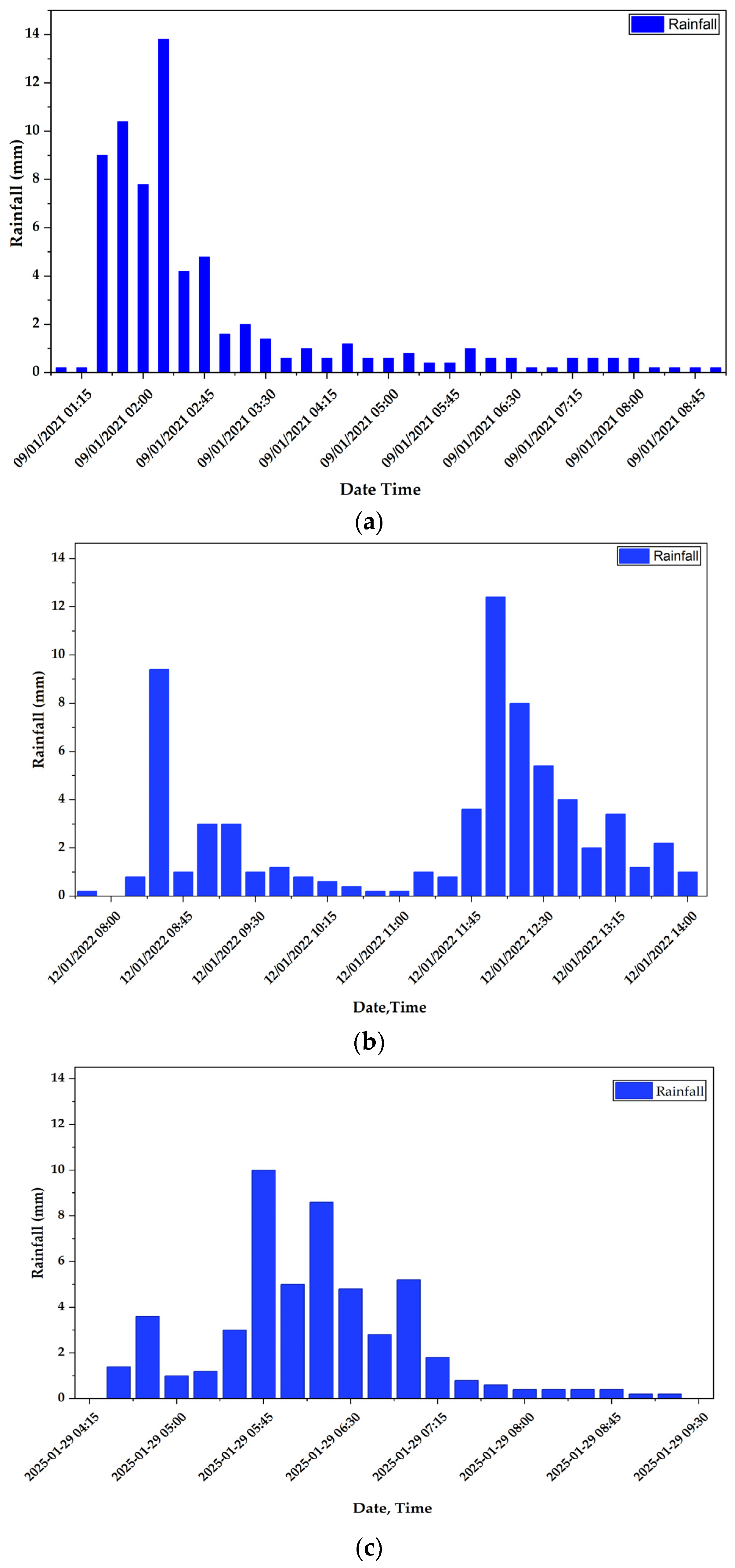 72], who presented that increased imperviousness and enhanced hydraulic connectivity in urban areas lead to elevated stream power and rapid flow acceleration during extreme rainfall events. Although these velocities exceed typical natural-channel conditions, they are physically plausible for short-duration peak flows in confined concrete-lined channels and indicate elevated erosive and structural risk associated with such drainage systems.