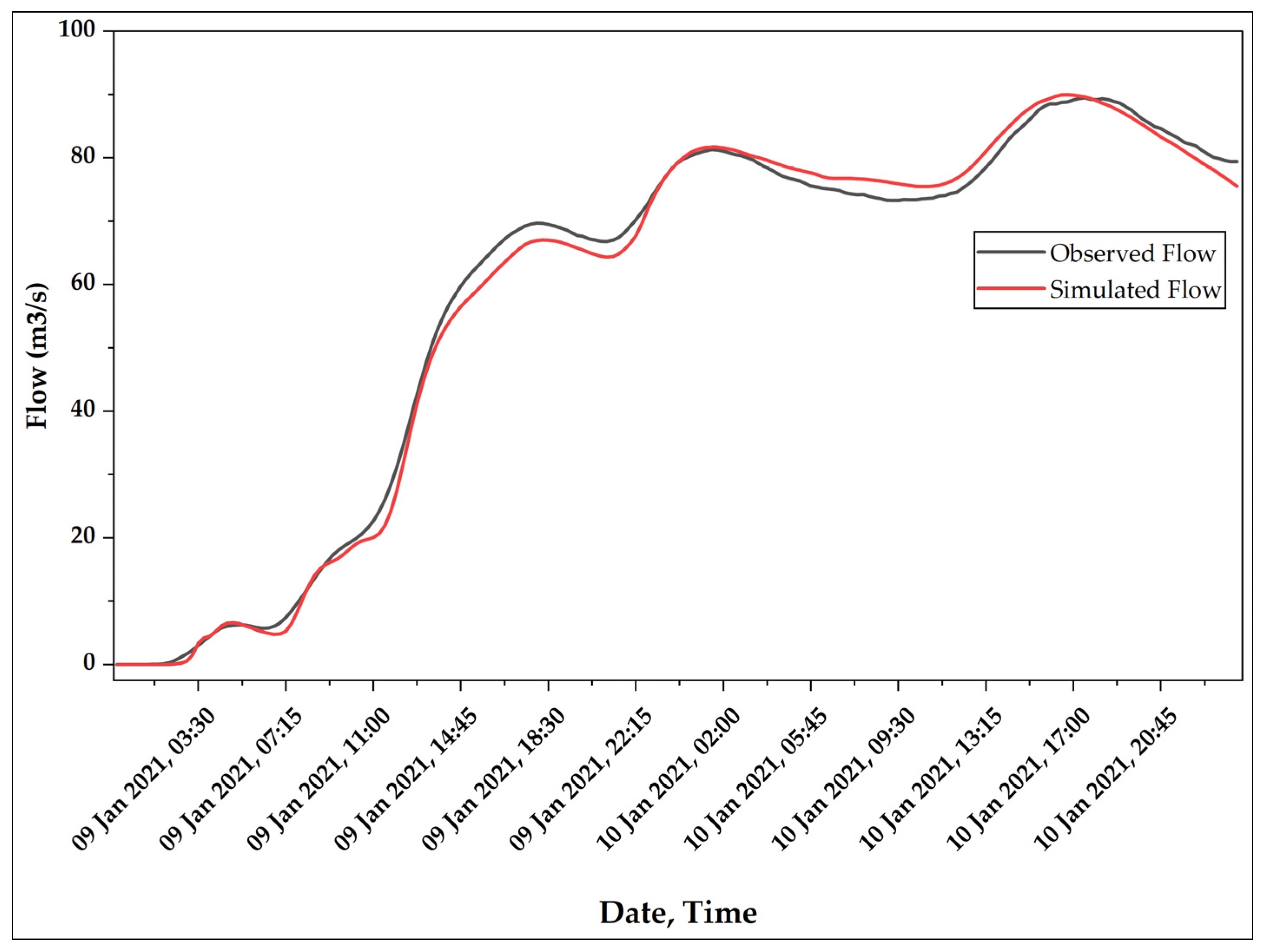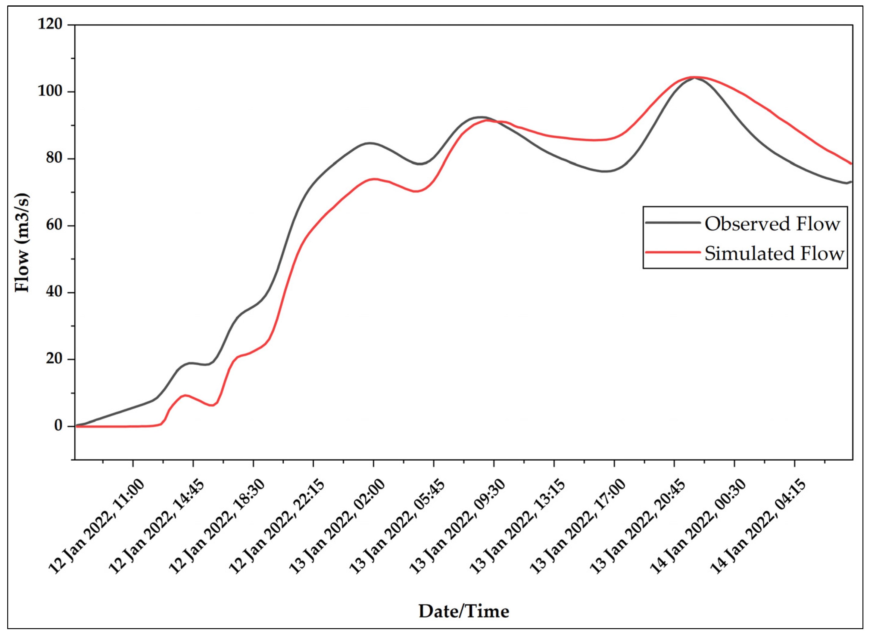 The calibrated model parameters were used for the validation of flow using an independent rainfall event which occurred on 12 January 2022 and the corresponding observed flow event and the results are presented in