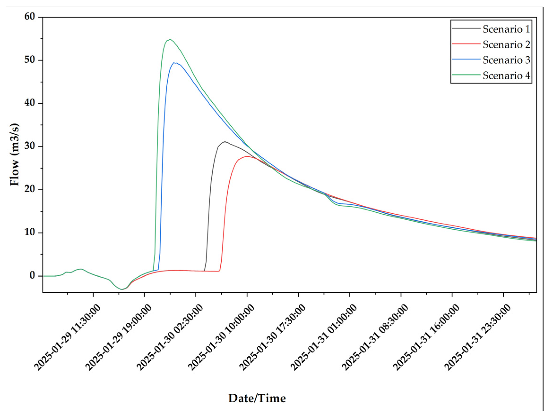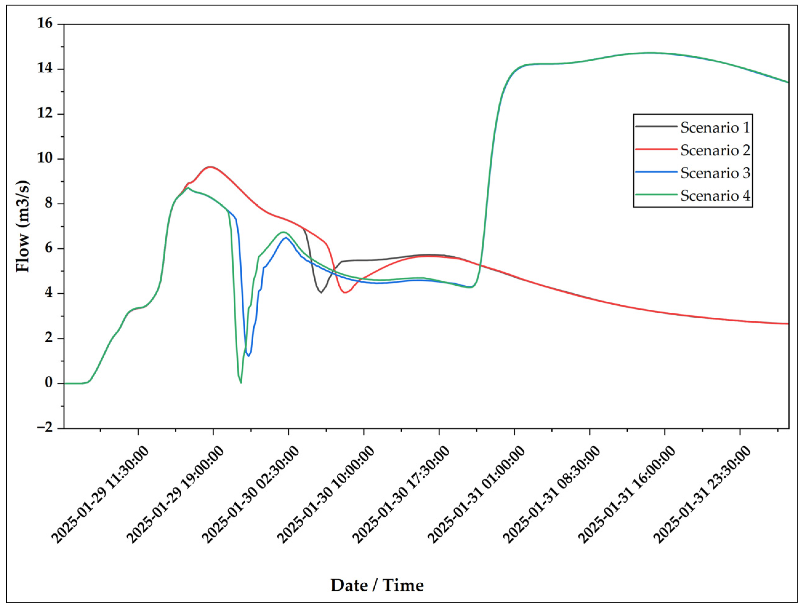 At the main Chongwe River outlet, the downstream influence of upstream concrete-lining was also evident, although the magnitude of hydrological changes was less pronounced. Comparing Scenario 4 (concrete-lined, no dams) with Scenario 3 (natural channels, no dams) showed that peak flow increased by 4.6% from 73.60 m