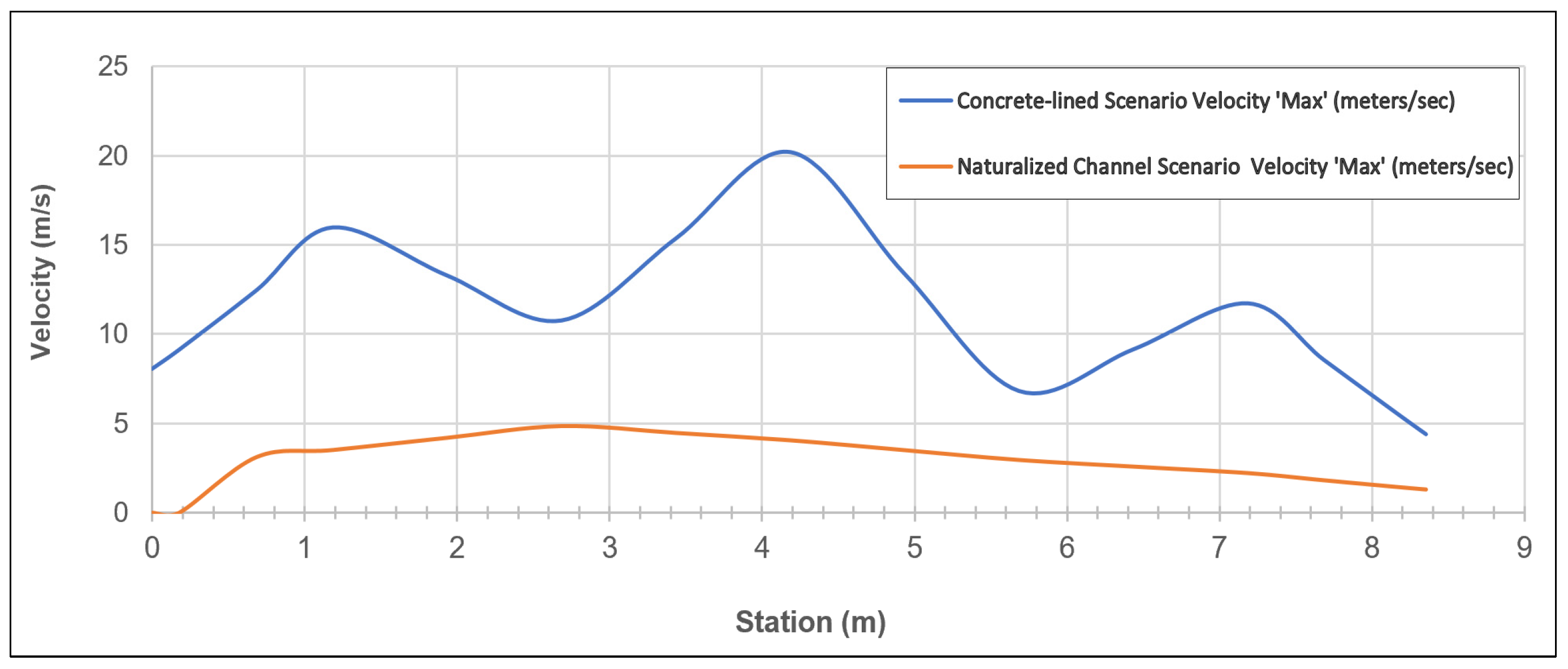 Figure 15, in which the localized instantaneous maximum velocity outputs across the concrete-lined main drainage channel were extracted for both the concrete-lined and natural channel scenarios and compared. Minor discontinuities are observed in the results at some junctions in