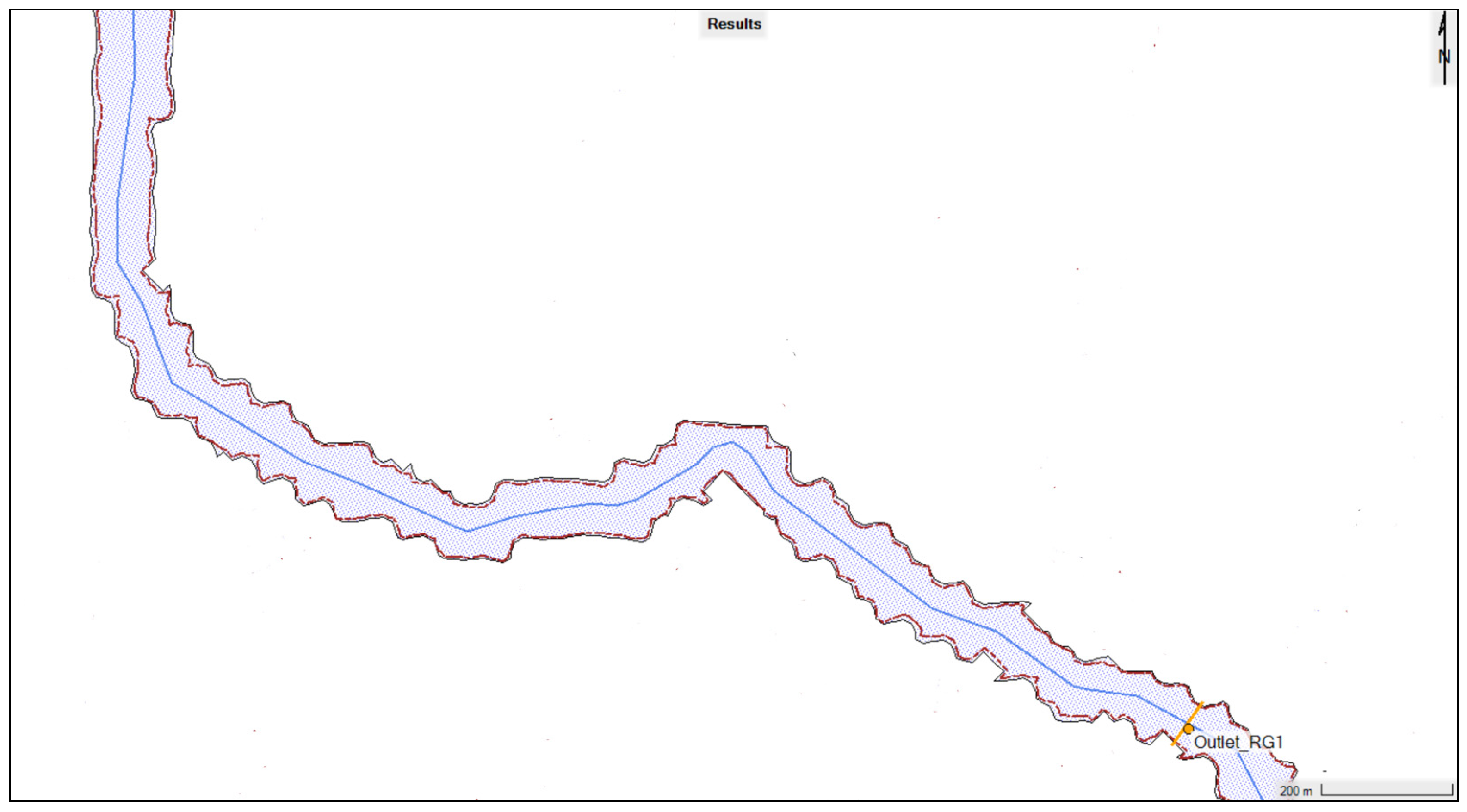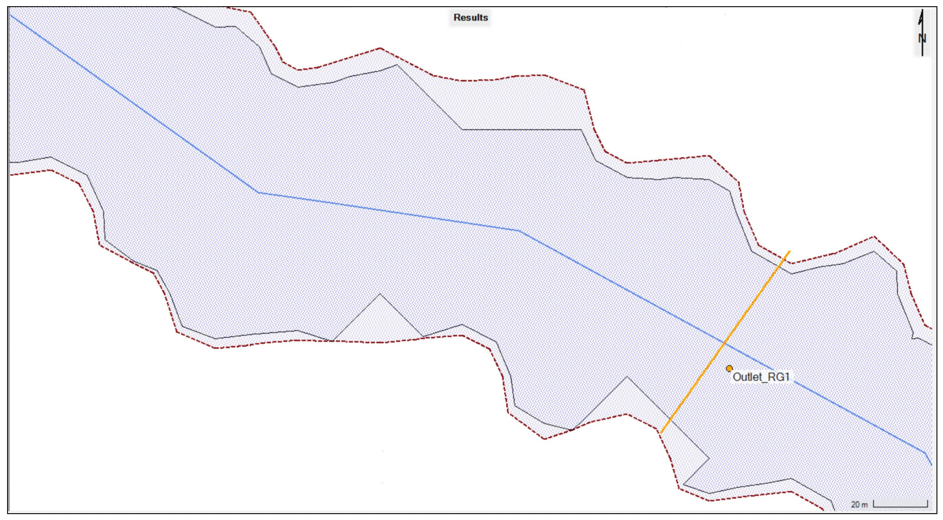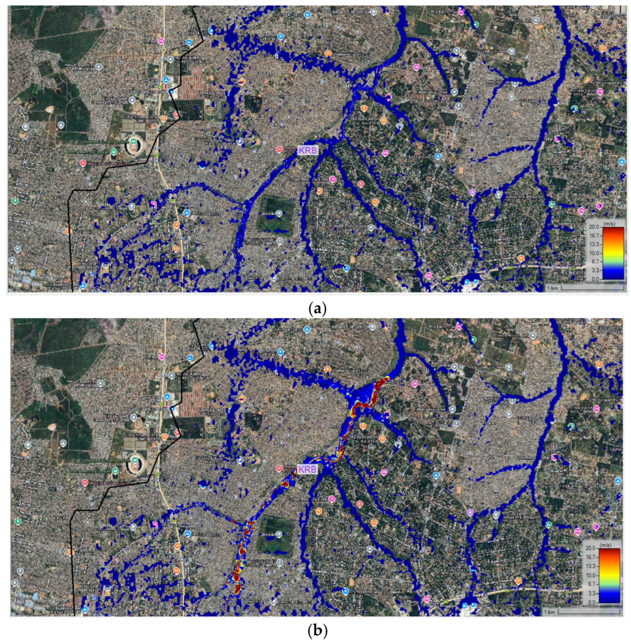 The 2D model was executed using a stable timestep of 1 min that satisfied the Courant–Friedrichs–Lewy (CFL) stability condition with a computational mesh designed to balance numerical stability and representation of key hydraulic features. A coarser grid of 100 m was applied across the wider floodplain, while locally refined cells of 2 m resolution were introduced along river channels and concrete-lined drainage channels using breaklines to better resolve channel geometry and flow acceleration. Under these conditions, the reported velocities of up to approximately 20 m/s represent localized instantaneous maximum values occurring within confined, smooth concrete-lined sections during high flow conditions. Such increases in instantaneous maximum flow velocity are in line with the reported findings of Fletcher et al. [