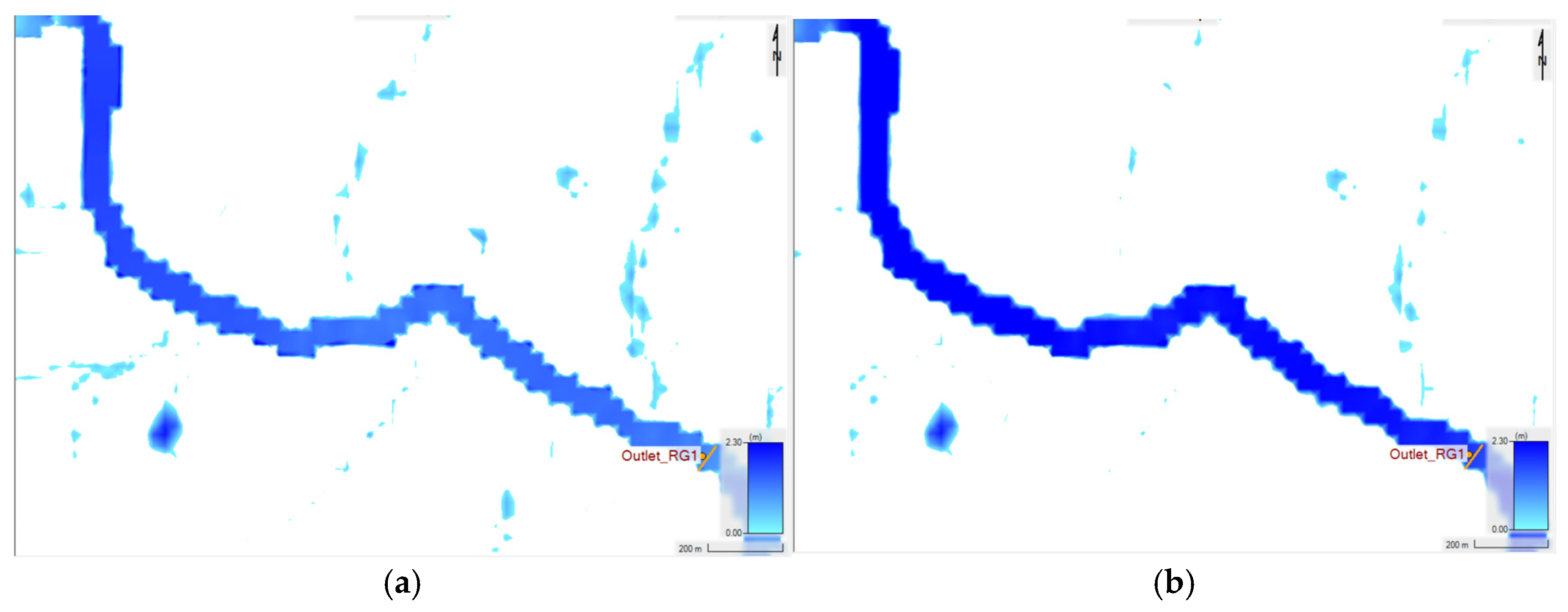 48]. Furthermore, concrete channels are often more directly connected to impervious urban surfaces, which increases both the velocity and volume of runoff entering the drainage channel system. As a result, the flow becomes more concentrated, contributing to elevated flood levels and wider flood inundation widths at the catchment outlet under the modelled conditions.