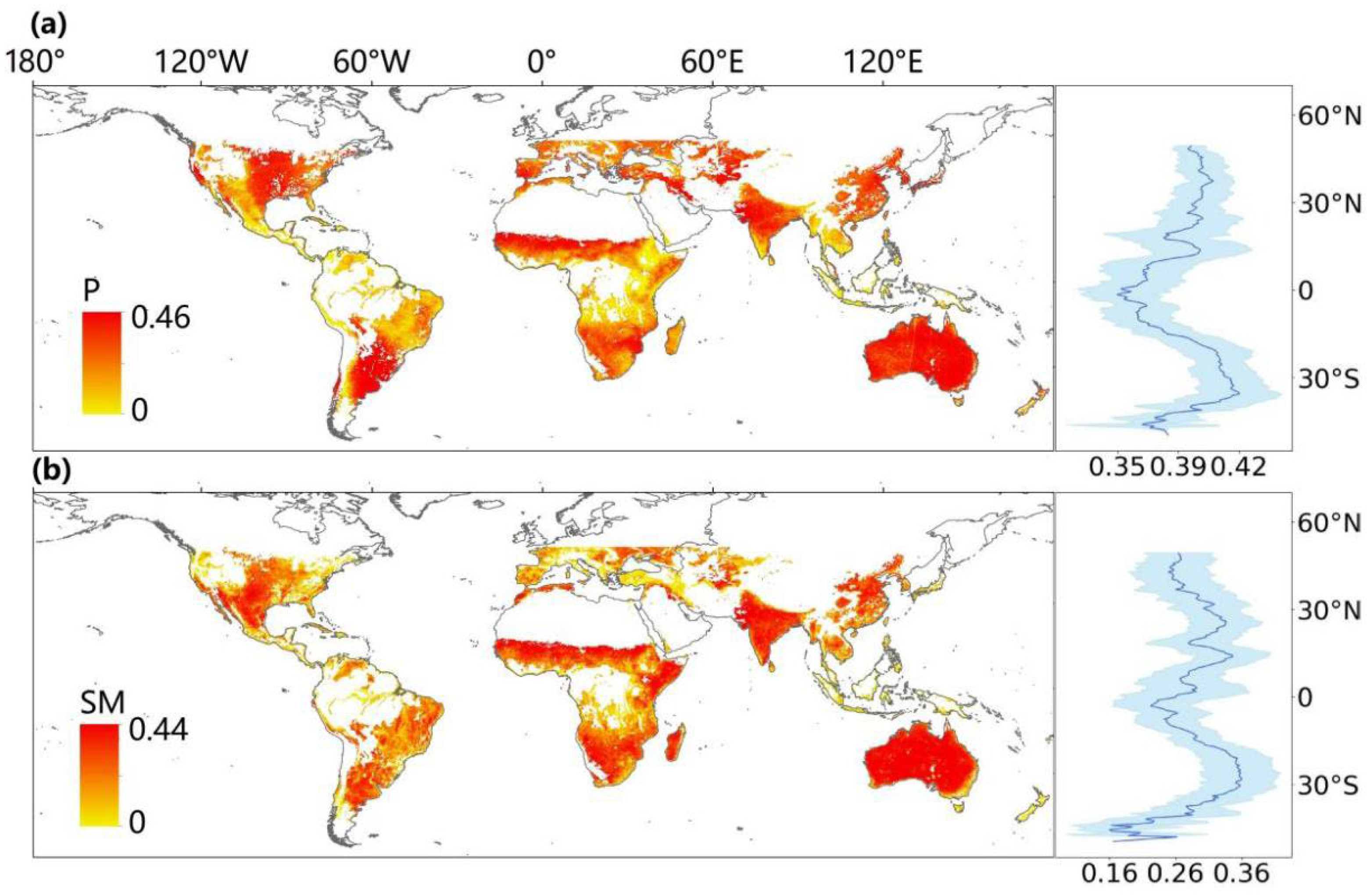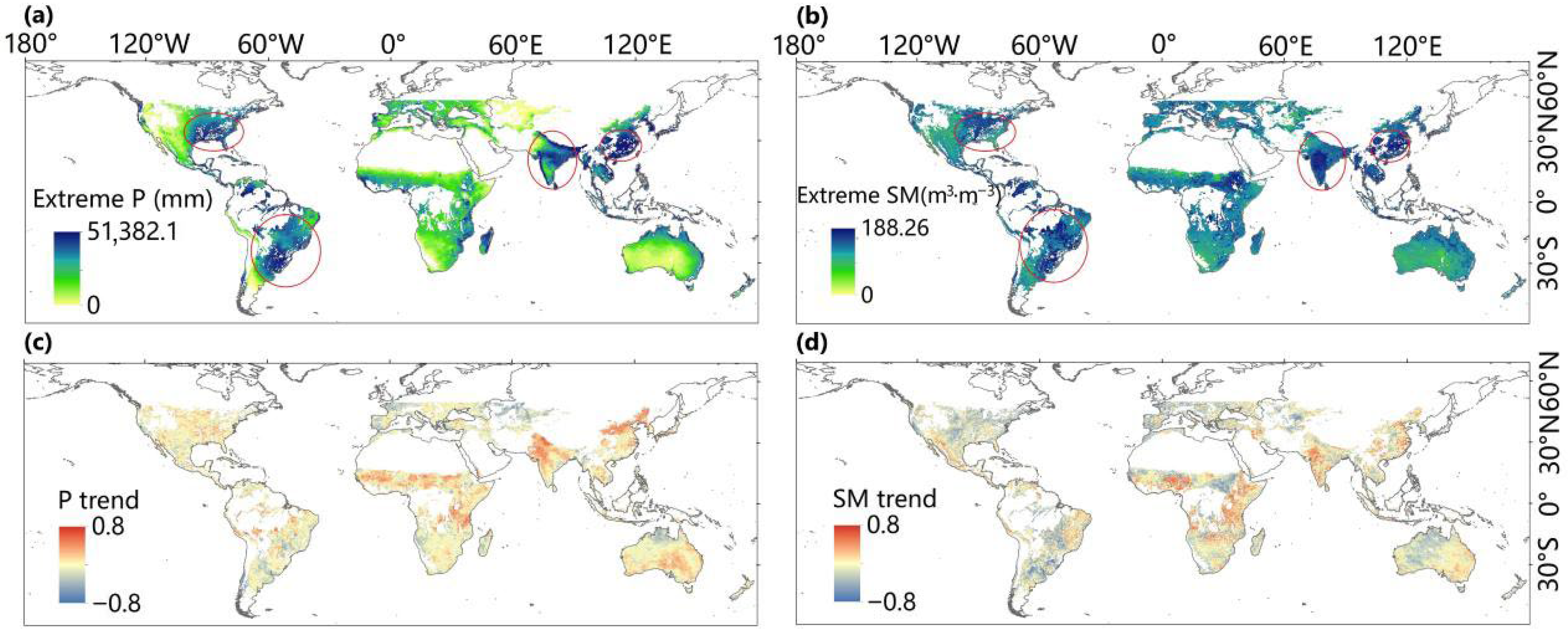 3.1. Spatiotemporal Changes in SM and P Extremes