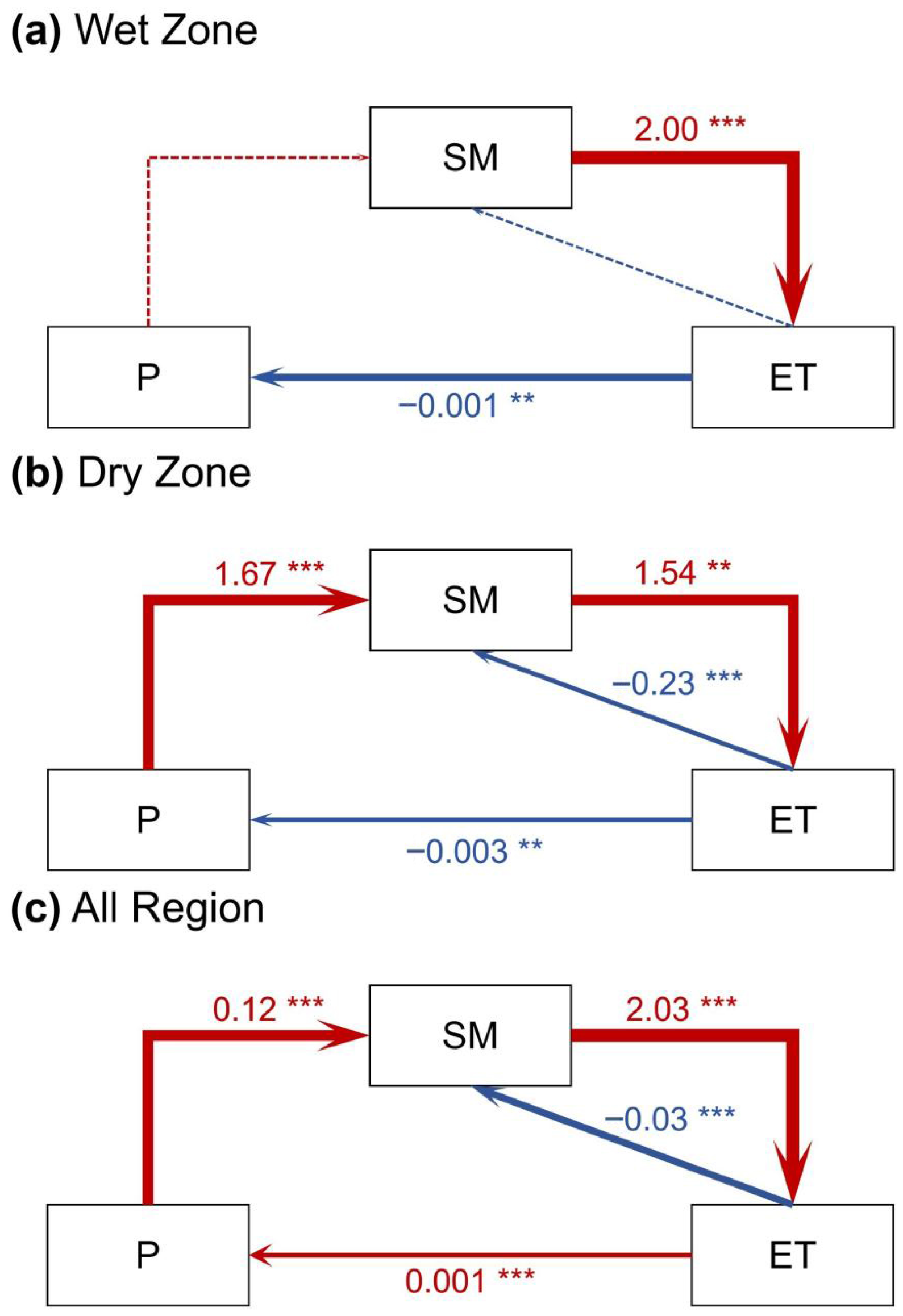 | Dry Zone | ET | P | −0.0010 | 1.2298 | −2.5194 | 0.0118 |