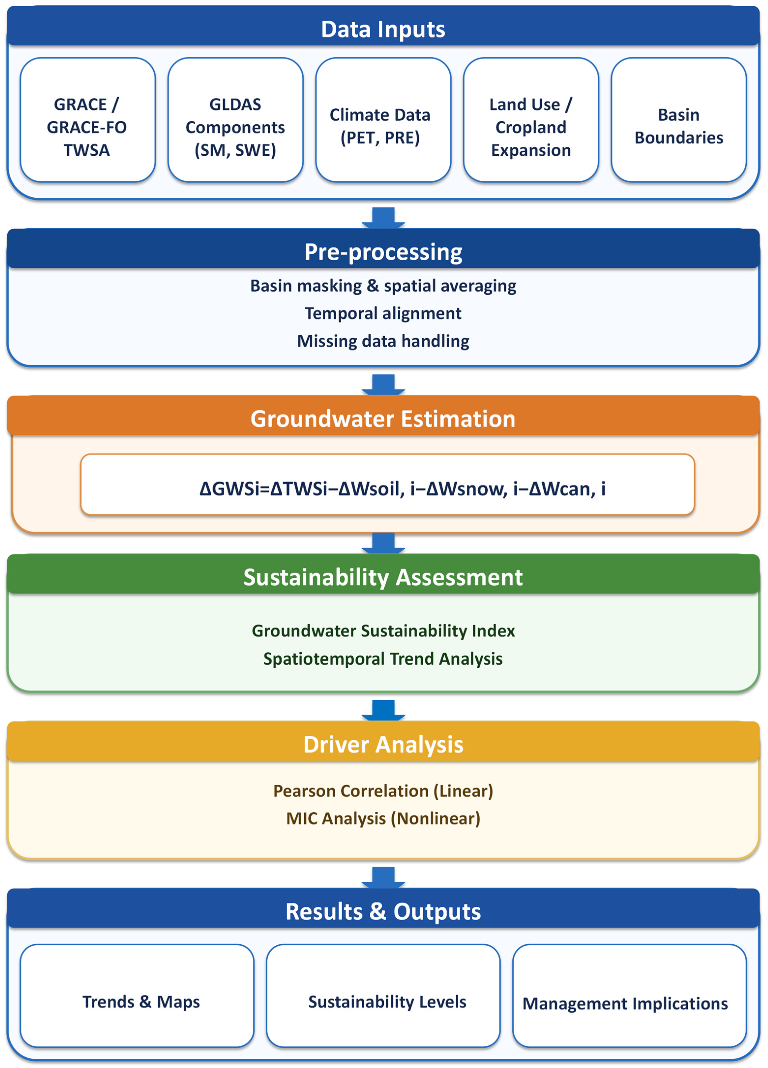 | Satellite gravimetry data | GRACE/GRACE-FO Mascon RL06 (CSR) | 0.25° × 0.25° | April 2002–December 2022 (249 months) | Retrieval of terrestrial water storage anomalies (TWSA) and estimation of groundwater storage changes (ΔGWS) |