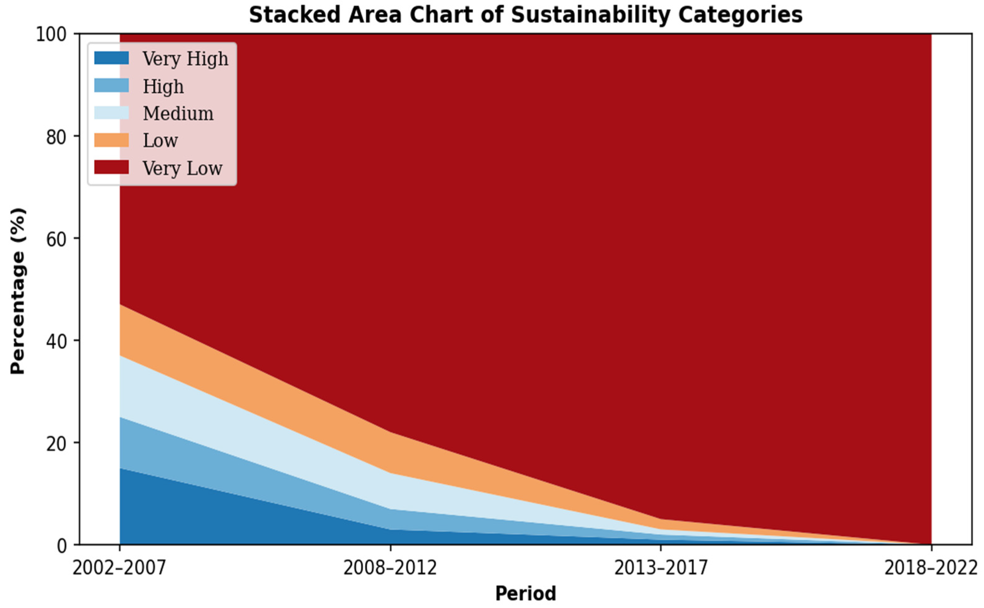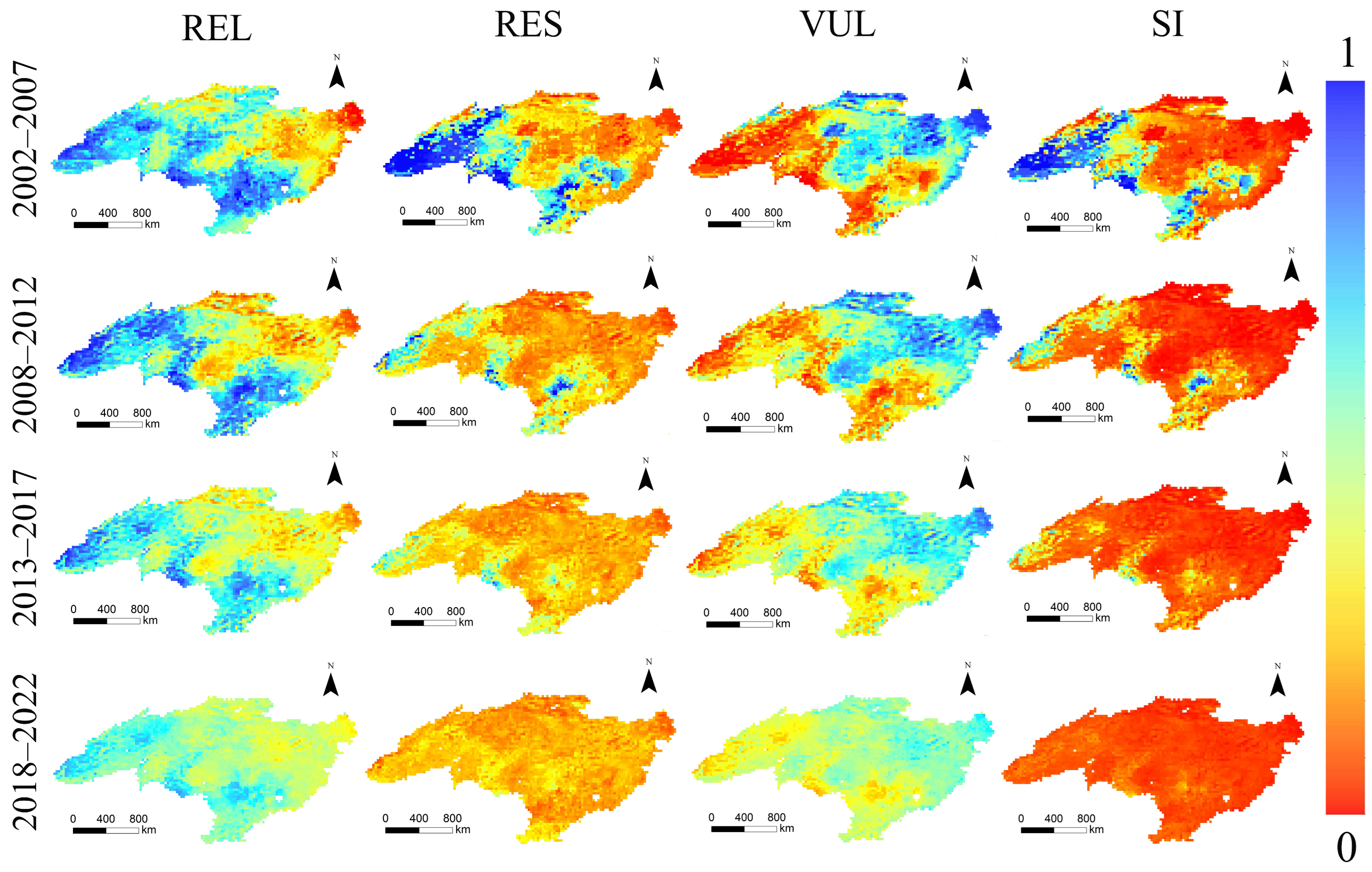 - Persistent decline in groundwater sustainability, characterized by reduced reliability and resilience and increasing system vulnerability. Groundwater sustainability consistently deteriorated over the study period, manifested by weakened reliability, reduced recovery capacity, and heightened sensitivity to external disturbances. The SI values for the four successive stages were 0.32, 0.14, 0.09, and 0.06, respectively, while the proportion of areas with extremely low sustainability increased from 51.6% to 99.6%, covering nearly the entire basin. Notably, although precipitation exhibited an increasing trend during the same period, groundwater conditions did not improve and instead continued to deteriorate. In contrast, sown area (MIC = 0.98) and nighttime light intensity (MIC = 0.92) showed much stronger synchronicity with groundwater sustainability changes. This indicates that groundwater dynamics are no longer primarily controlled by natural recharge, but are increasingly dominated by agricultural expansion and urban development. The evolution of REL, RES, and VUL further corroborates this shift, highlighting a transition from natural regulation to human water-use dominance and a marked increase in regional groundwater security risks.