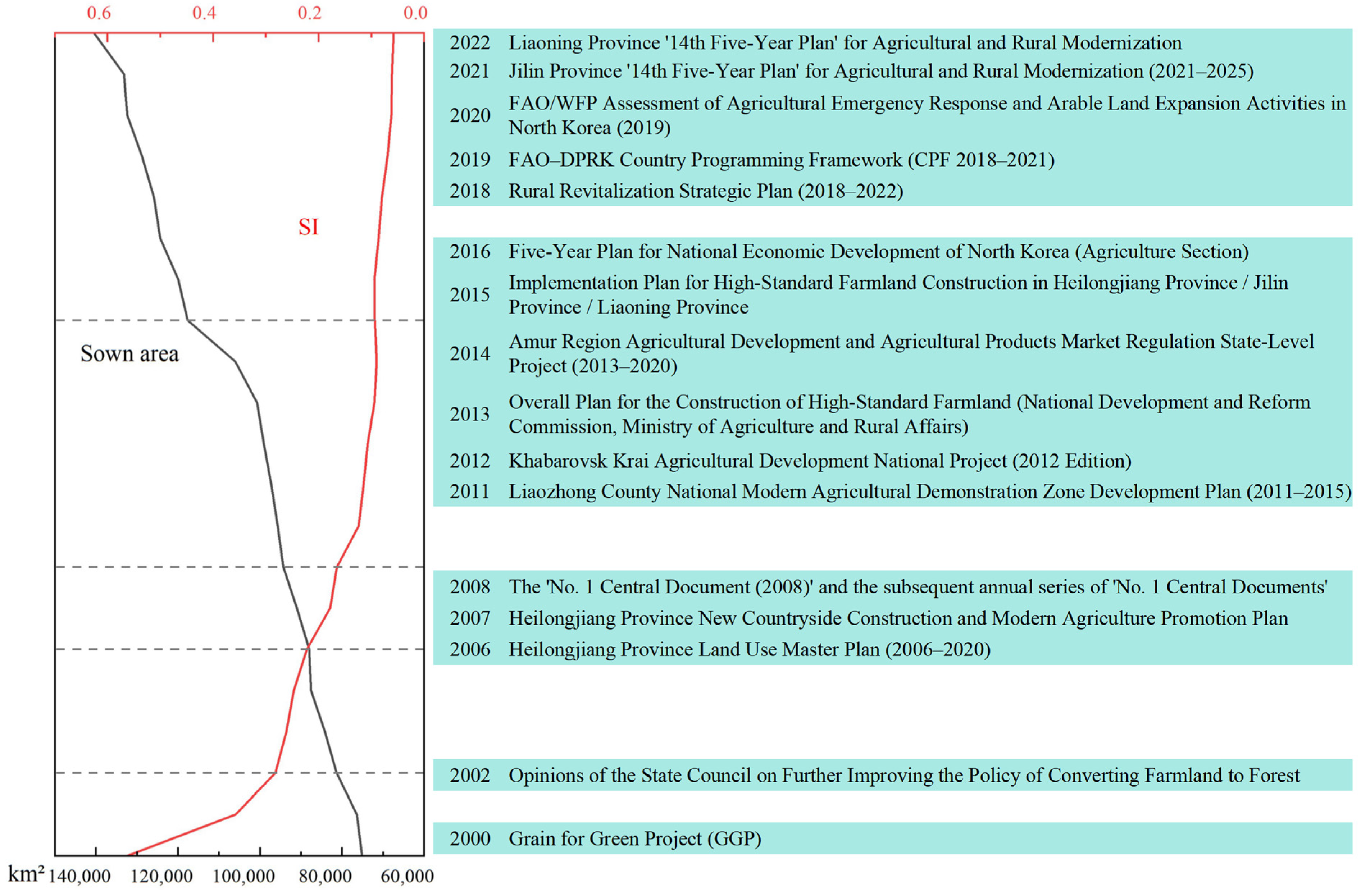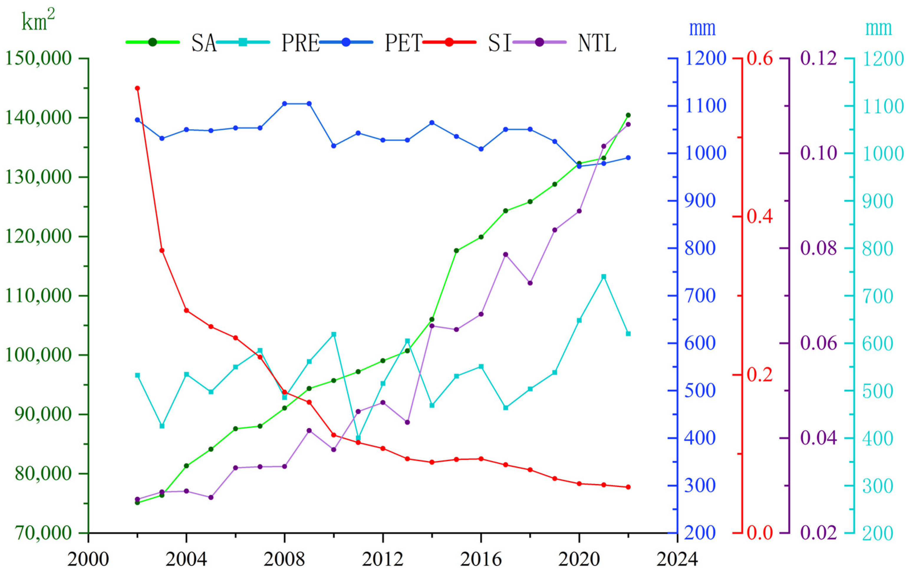 - Agricultural expansion and human activities are the primary drivers of declining groundwater sustainability, with policy factors as the underlying causes. MIC analysis reveals that sown area (SA) exerts the strongest influence on SI (0.98), followed by nighttime light intensity (NTL, 0.92), both substantially exceeding the impacts of climatic factors. During 2002–2022, cropland area increased by 0.96%, built-up land by 75.07%, and sown area by 86.97%. Policy orientations such as “high-standard farmland construction,” “grain yield enhancement,” and “rural revitalization” have promoted agricultural intensification well beyond natural recharge capacity, constituting a key institutional driver of long-term groundwater depletion.