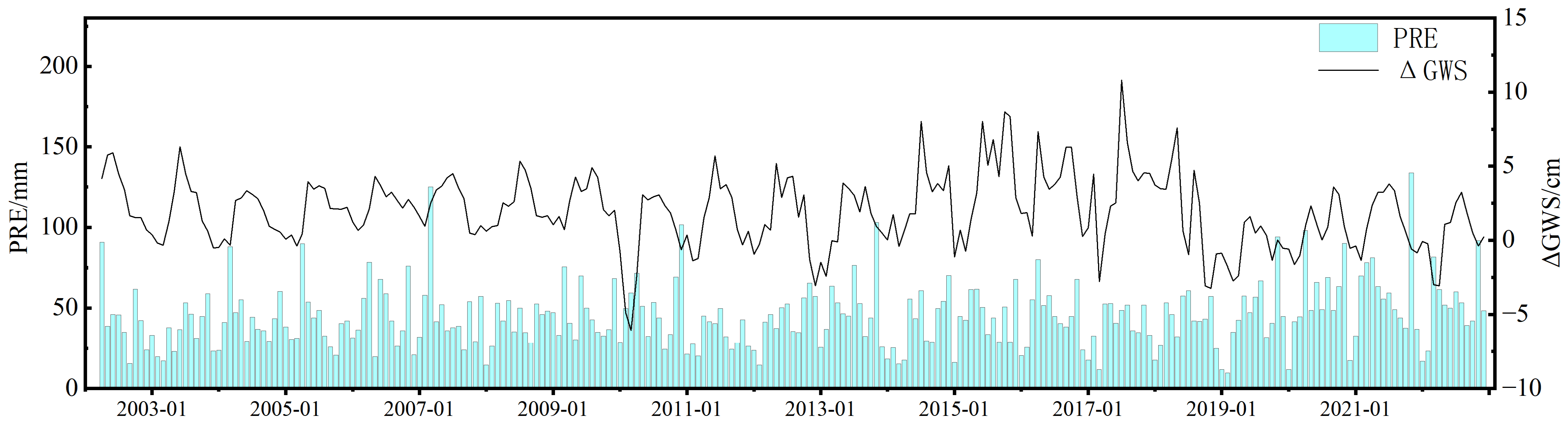 3.4.1. Relationship Between Precipitation and ΔGWS