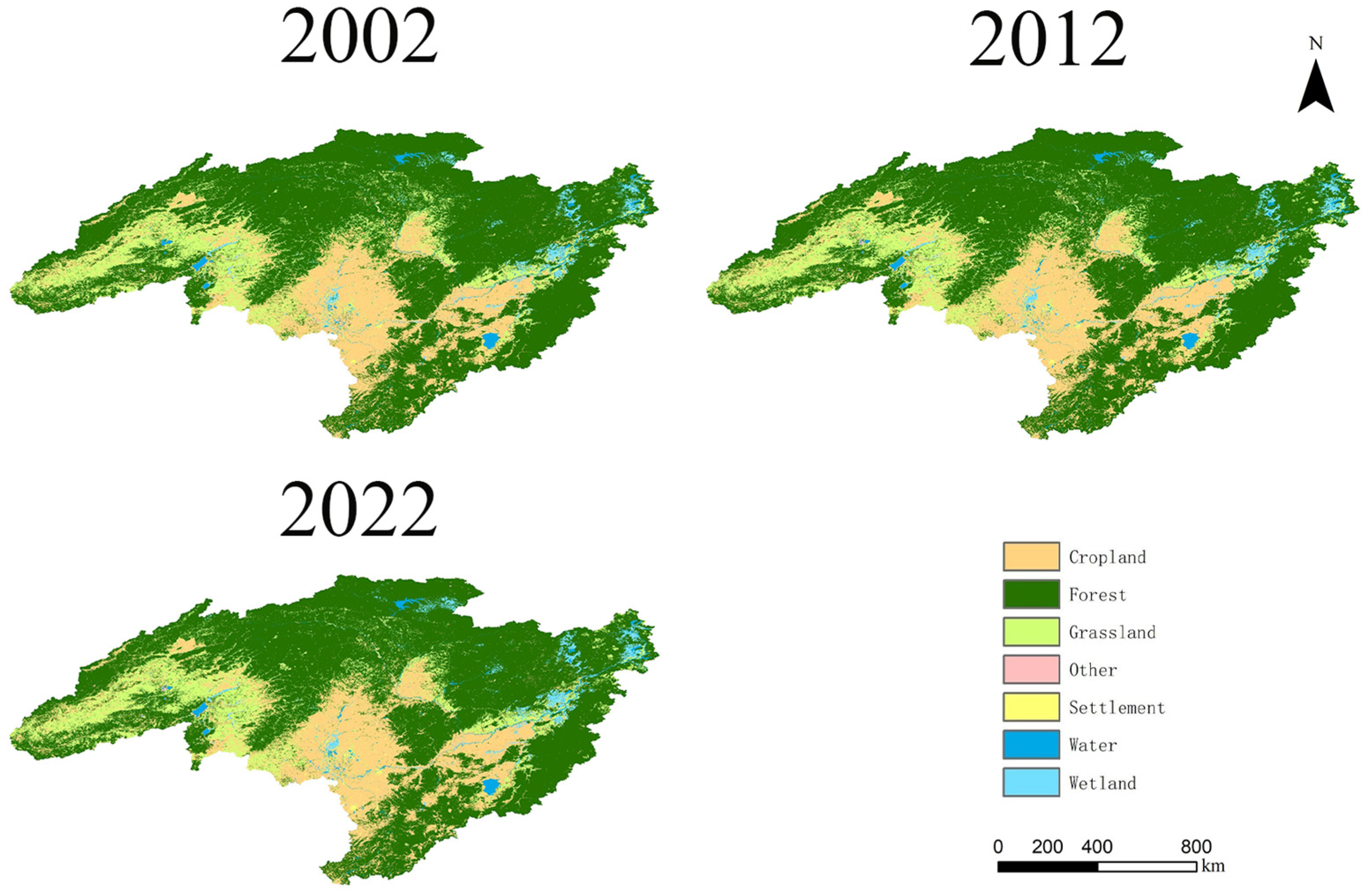 - Copernicus Climate Change Service (C3S). Land Cover Classification Gridded Maps from 1992 to Present Derived from Satellite Observations (Version 2.1.1); Climate Data Store (CDS): Bonn, Germany, 2025. [Google Scholar] [CrossRef]