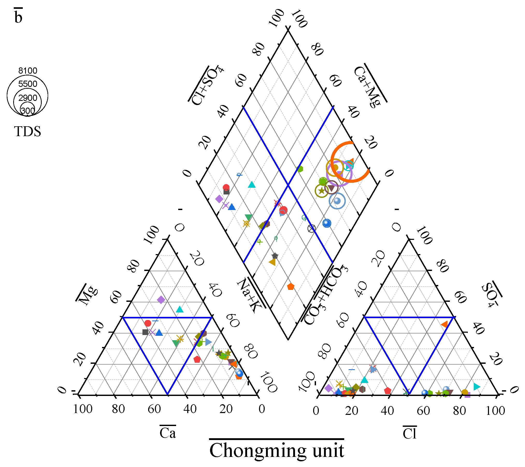 - Karmegam, U.; Chidambaram, S.; Prasanna, M.V.; Sasidhar, P.; Manikandan, S.; Johnsonbabu, G.; Dheivanayaki, V.; Paramaguru, P.; Manivannan, R.; Srinivasamoorthy, K.; et al. A study on the mixing proportion in groundwater samples by using Piper diagram and Phreeqc model. Chin. J. Geochem. 2011, 30, 490–495. [Google Scholar] [CrossRef]