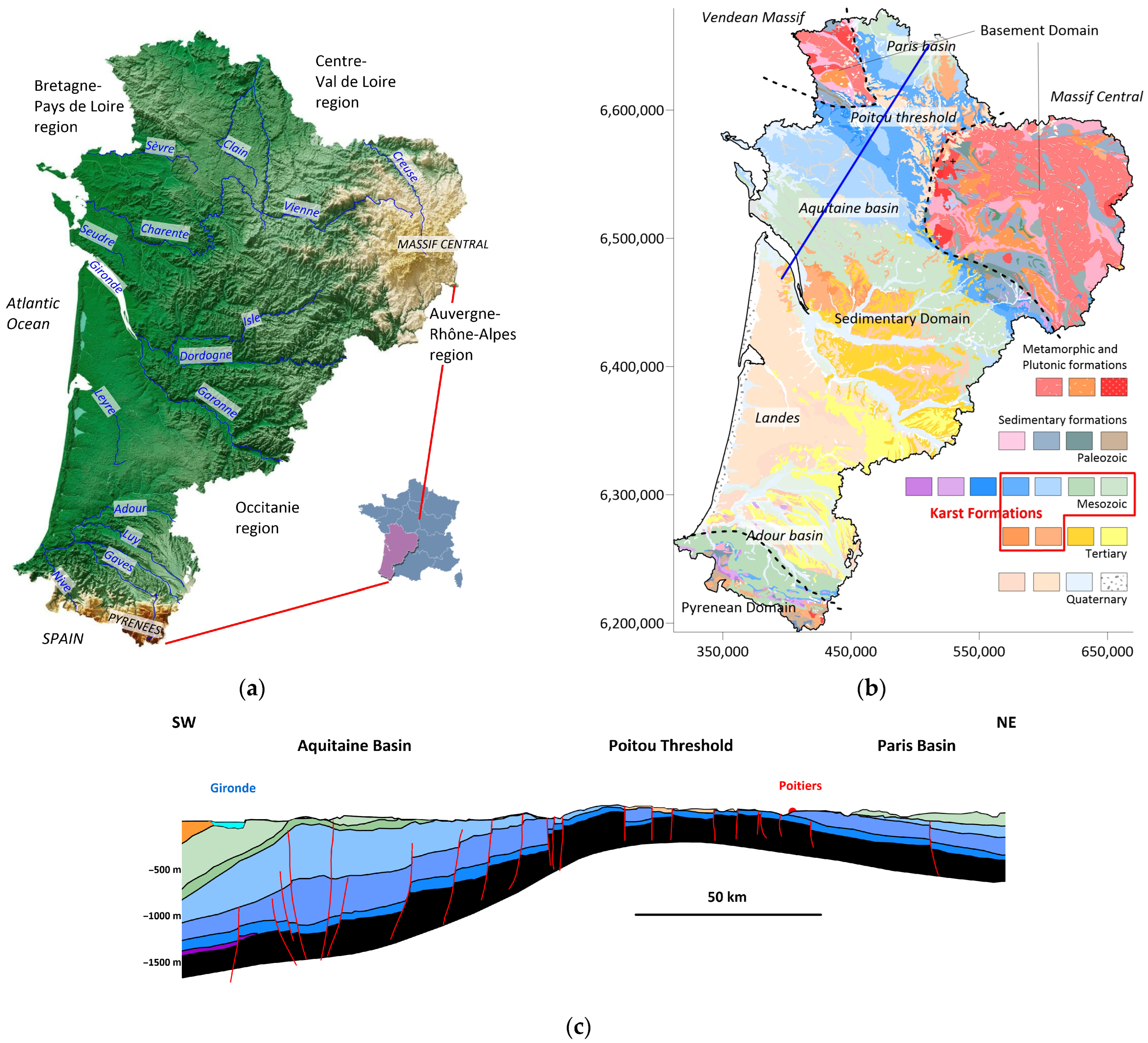- Gaillard, T.; Moreau, M.; Mari, J.-L. Seismic and Stratigraphic Characterization of Karstogenic Horizons in a Sequence of Carbonate Deposits: Example of the Dogger Limestones of the Poitou Threshold. E3S Web Conf. 2024, 504, 05005. [Google Scholar] [CrossRef]