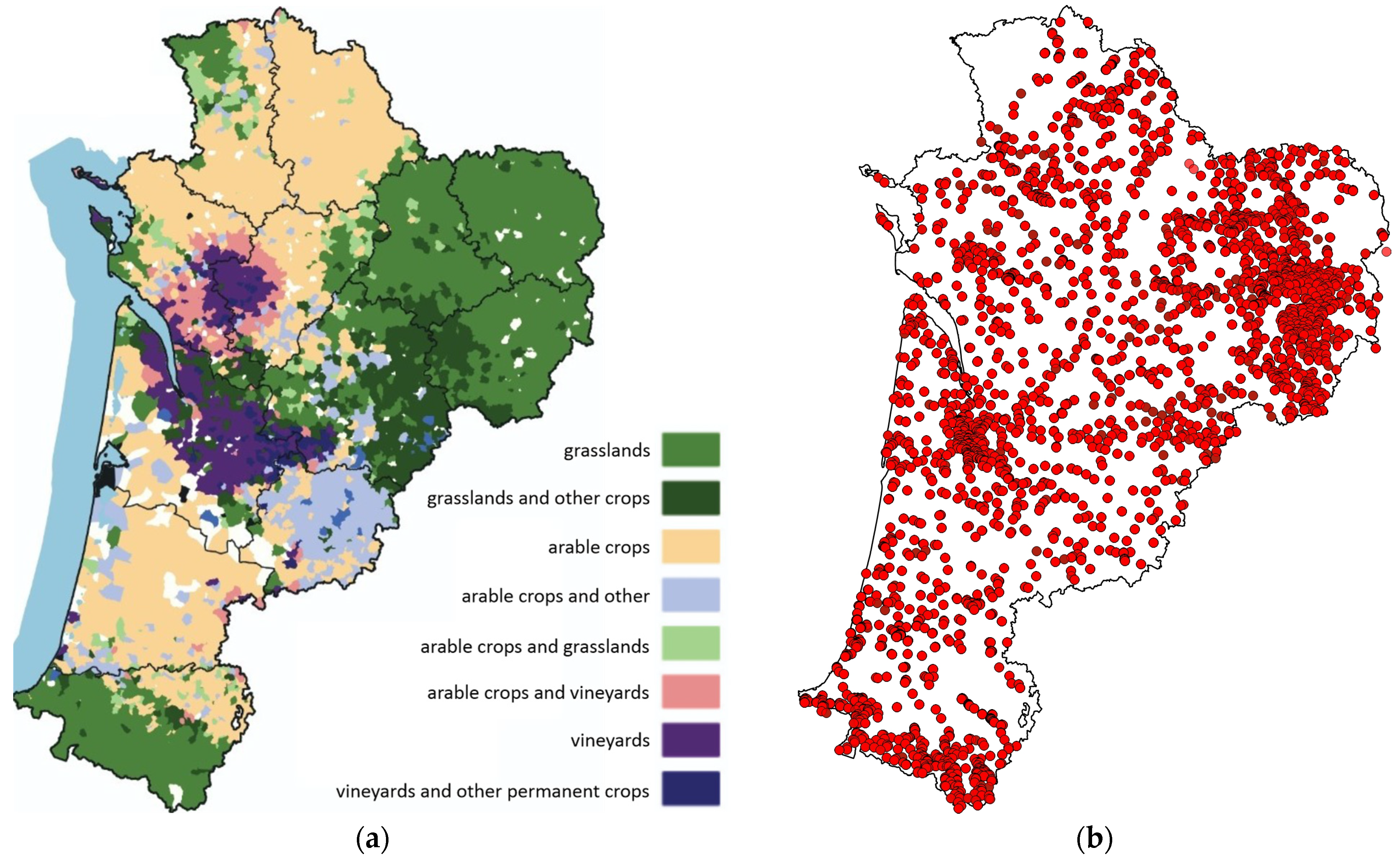 - DRAAF L’occupation Des Sols Agricoles En Nouvelle- Aquitaine Entre 1970 et 2020. Available online: https://draaf.nouvelle-aquitaine.agriculture.gouv.fr/IMG/pdf/agrestena_etudes_48_avril2024_assolements_v7.pdf (accessed on 7 August 2025).