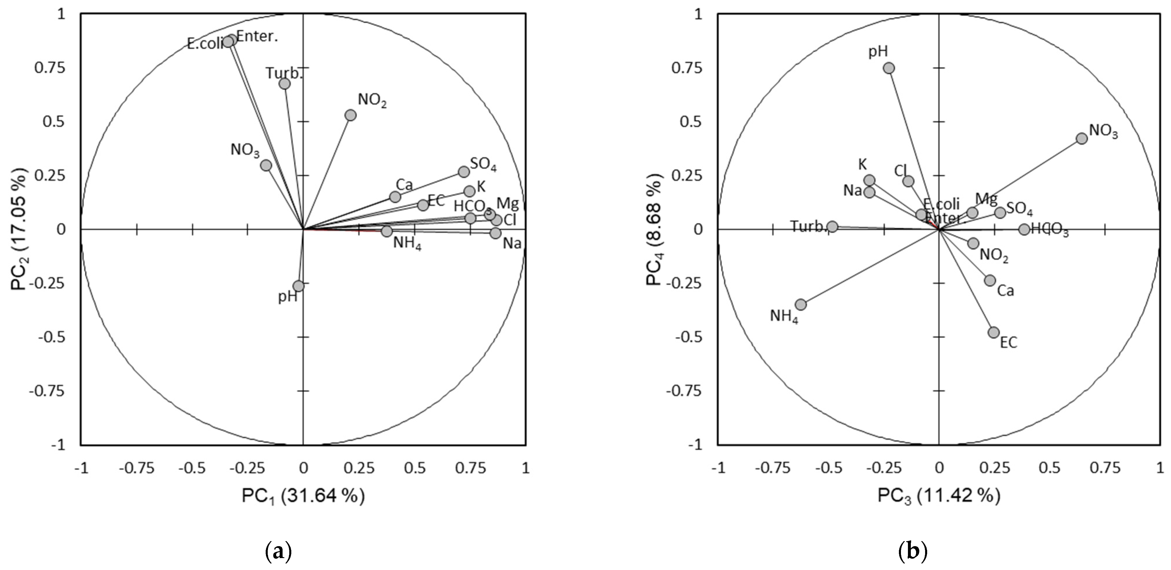 - Helena, B.; Pardo, R.; Vega, M.; Barrado, E.; Fernandez, J.M.; Fernandez, L. Temporal Evolution of Groundwater Composition in an Alluvial Aquifer (Pisuerga River, Spain) by Principal Component Analysis. Water Res. 2000, 34, 807–816. [Google Scholar] [CrossRef]