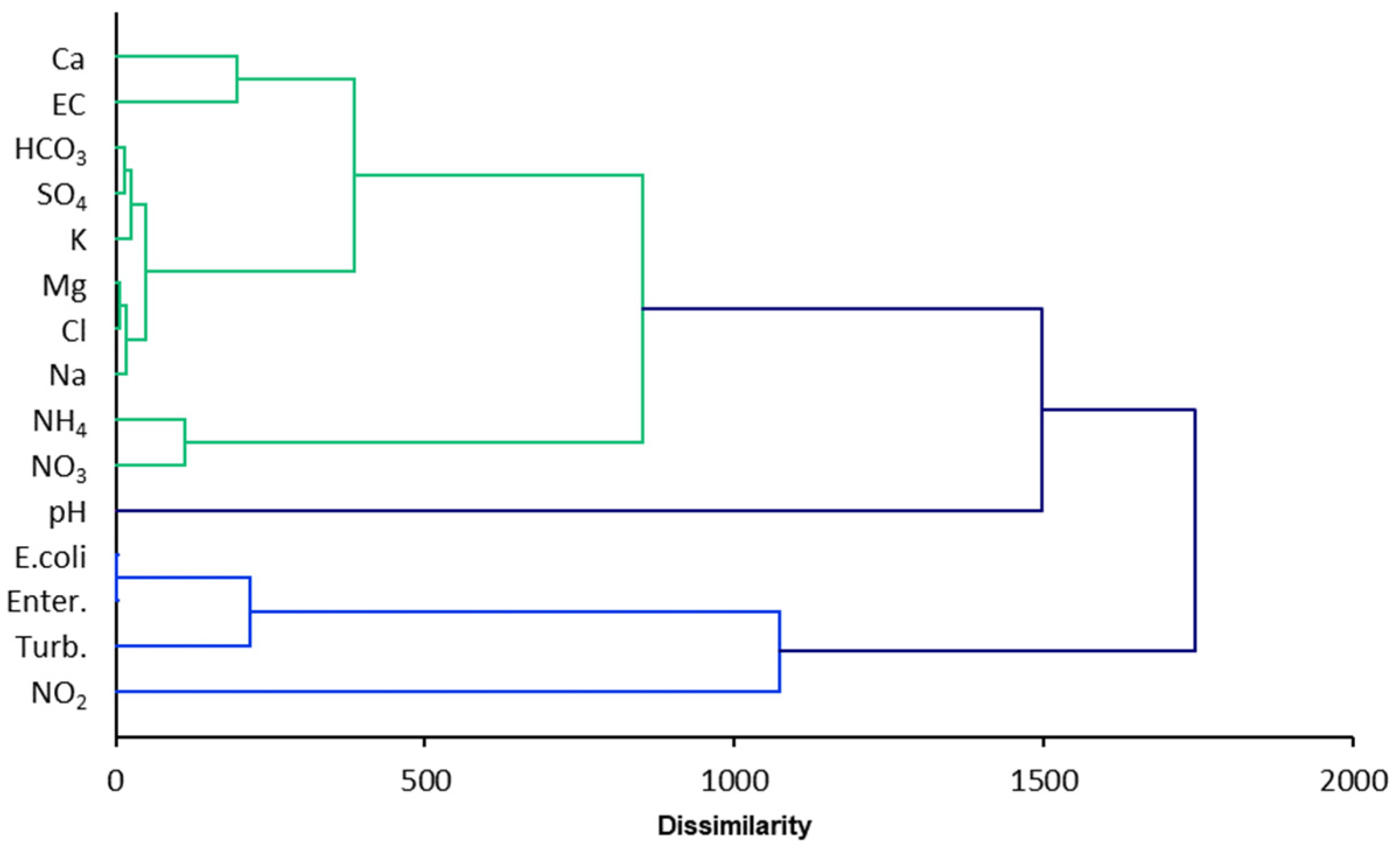 - Tiouiouine, A.; Yameogo, S.; Valles, V.; Barbiero, L.; Dassonville, F.; Moulin, M.; Bouramtane, T.; Bahaj, T.; Morarech, M.; Kacimi, I. Dimension Reduction and Analysis of a 10-Year Physicochemical and Biological Water Database Applied to Water Resources Intended for Human Consumption in the Provence-Alpes-Cote d’azur Region, France. Water 2020, 12, 525. [Google Scholar] [CrossRef]