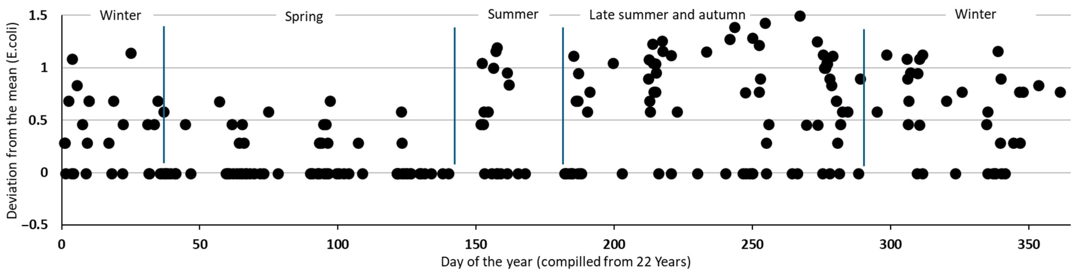 - Pachepsky, Y.A.; Shelton, D.R. Escherichia Coli and Fecal Coliforms in Freshwater and Estuarine Sediments. Crit. Rev. Environ. Sci. Technol. 2011, 41, 1067–1110. [Google Scholar] [CrossRef]