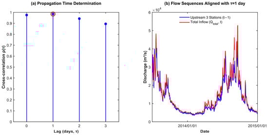 Flow-stratified travel time analysis (low: ≤ 5788 m3/s; medium: 5788 < ≤ 16,869 m3/s; high: > 16,869 m3/s) revealed that the optimal was 1 day for the low-flow (1 = 0.902) and high-flow (1 = 0.924) groups, and 0 days for the medium-flow group (0 = 0.944, 1 = 0.942). Given the negligible difference in correlation coefficients (Δ = 0.002) and the physical expectation of a positive lag, a uniform propagation time of = 1 day was adopted for the entire series.