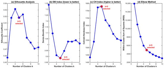 Multi-criteria evaluation for determining the number of clusters: (a) Silhouette Coefficient; (b) Davies–Bouldin Index; (c) Calinski–Harabasz Index; (d) Elbow Curve.