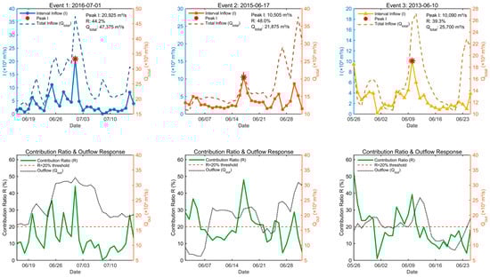 Three typical C4 events were selected for in-depth analysis (Figure 9). Collectively, these events revealed the key characteristics of interval inflow floods: sudden onset, high peak magnitude, and a substantial proportion of the total TGR inflow (with contribution ratios ranging from 40% to 50%).