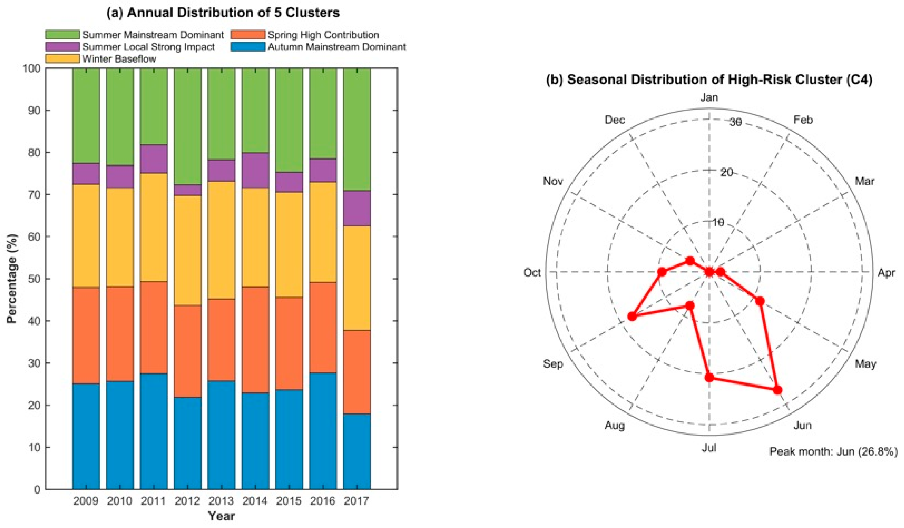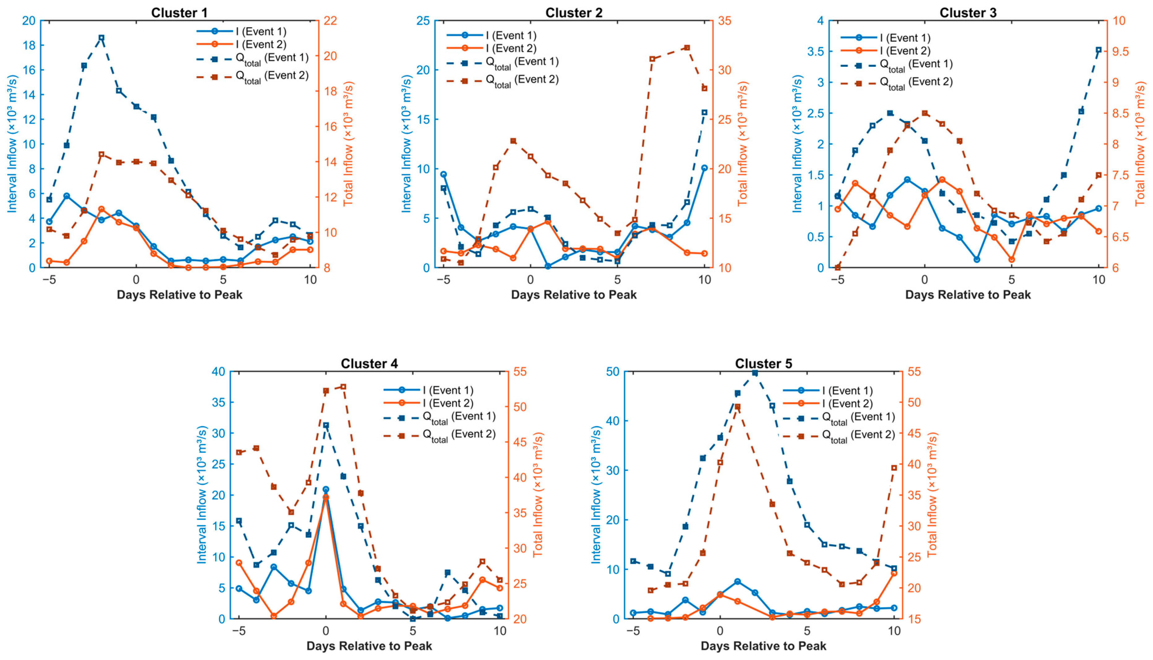 - Among these, Cluster C4 (the localized high-impact pattern) poses the greatest challenge to flood control. Characterized by the highest mean interval inflow (6425 m3/s) and contribution ratio (27.8%), these events are flashy (mean flashiness index: 1.48) and driven by local rainstorms, which implies a substantially shorter forecast lead time and necessitates dedicated nowcasting strategies.