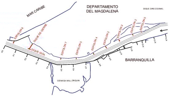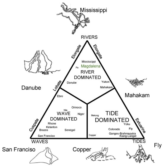 Prior to the construction of hydraulic works, the mouth of the Magdalena River exhibited a lobate delta morphology characterized by multiple channels, islands, and shallow depths. This configuration resulted from the dominance of fluvial processes, high sediment loads, and the relatively low energy of the Caribbean Sea, consistent with classifications of fluvial-dominated deltas (Figure 2) [19,20,21]. Historical bathymetries and maps confirm the presence of a multi-branch delta that posed persistent navigational difficulties since colonial times.