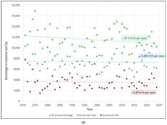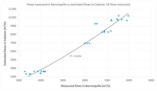 where is the measurement at the gauging station in cm, the depth record ranges from approximately 200 to 900 cm, so the flow in Calamar would range between 2100 m3/s and 14,000 m3/s. Obviously, the records show values of 18,000 m3/s measured at times of high water, but these values are uncertain because the water overflows the banks and are therefore very approximate [30].