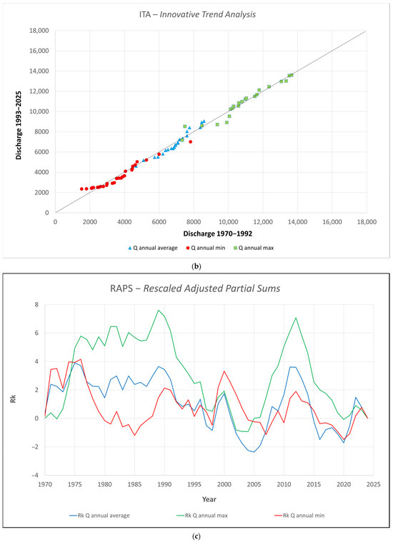 The gradient of peak and average flows shows a clear downward trend, with aver-age values between 1971 and 2025 shown in Figure 7a. An additional analysis was performed using the Innovative Trend Analysis (ITA) and the Rescaled Adjusted Partial Sums (RAPS) methods to detect potential trends and regime shifts in the discharge series.