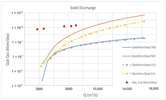 During field tests, measurements were taken of the sediment concentration of several vertical profiles across various sections of the channel, together with the channel’s flow measurement. In addition, the water level was recorded simultaneously during the experiments. Table 2 presents the data on the average geometric characteristics of the section: average depth , section width , and wet area of the section , driving slope measured with sensors on the date of the test, and flow measured during the campaign. The driving slope has been approximated with the water surface slope, as the influence of velocity energy is minimal. The last two columns of the table show Manning’s flow resistance coefficient and the total solid flow in Kton/day. Stations 3 and 4 are located on the arms of Cabica Island, and stations 6 and 8 are located on the arms of Rondón Island. The solid flow recorded during those days in the different sections is practically constant, with a value of 2000 Kton/day. This can be verified by the sum of the solid flows in the arms. The average liquid flow on those days was 7200 m3/s for a 0.12% sediment concentration.